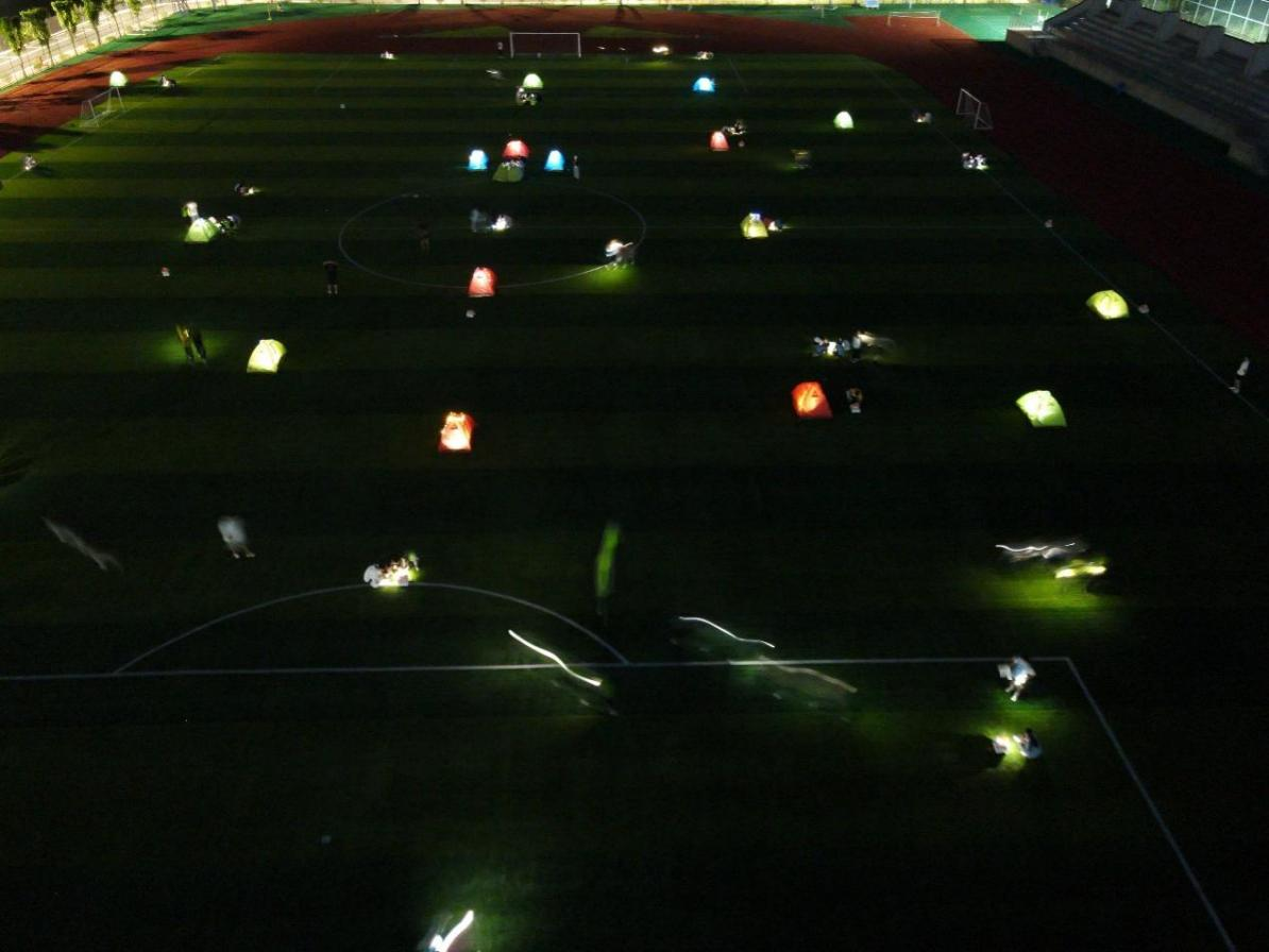 夜幕降临,随着裁判一声令下,操场上的探照灯关闭,操场内陷入黑暗,同时充当障碍物的帐篷里泛着柔光的相继被点亮,星星点点分布在操场上,散发着神秘的气氛。随着活动的开始,参与小组分批次出发,操场上充满了紧张刺激的氛围。