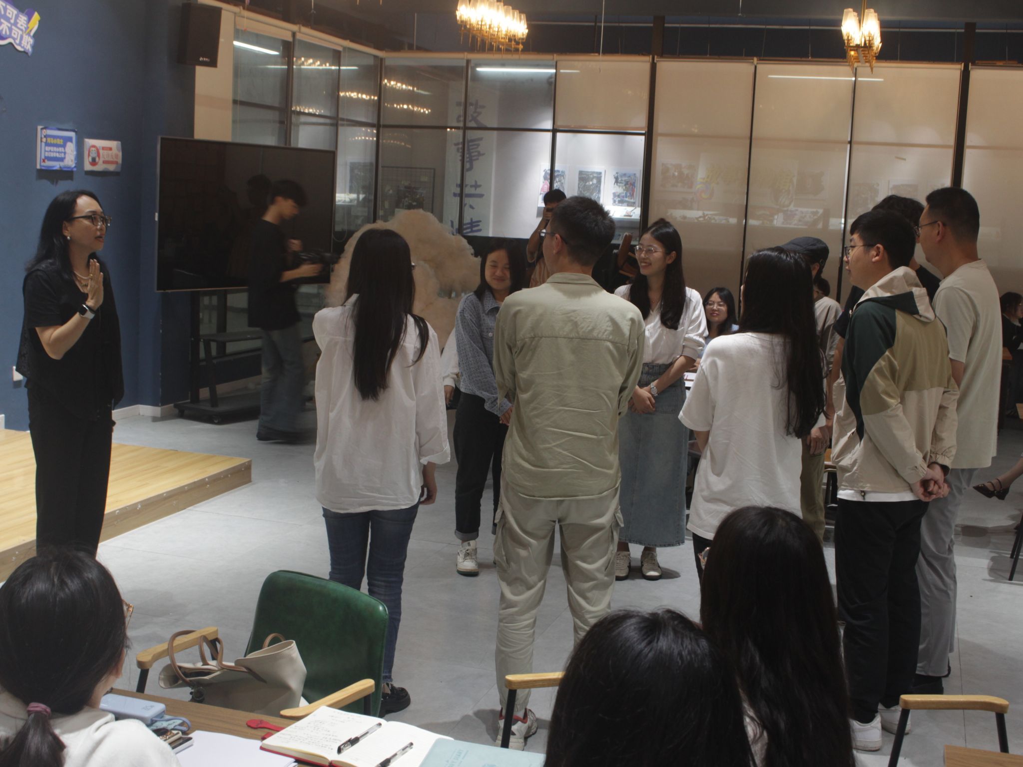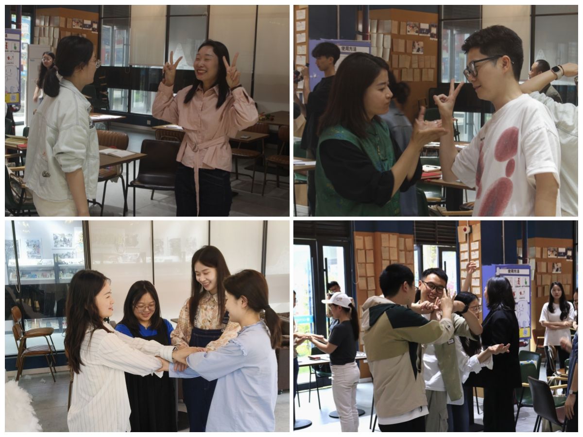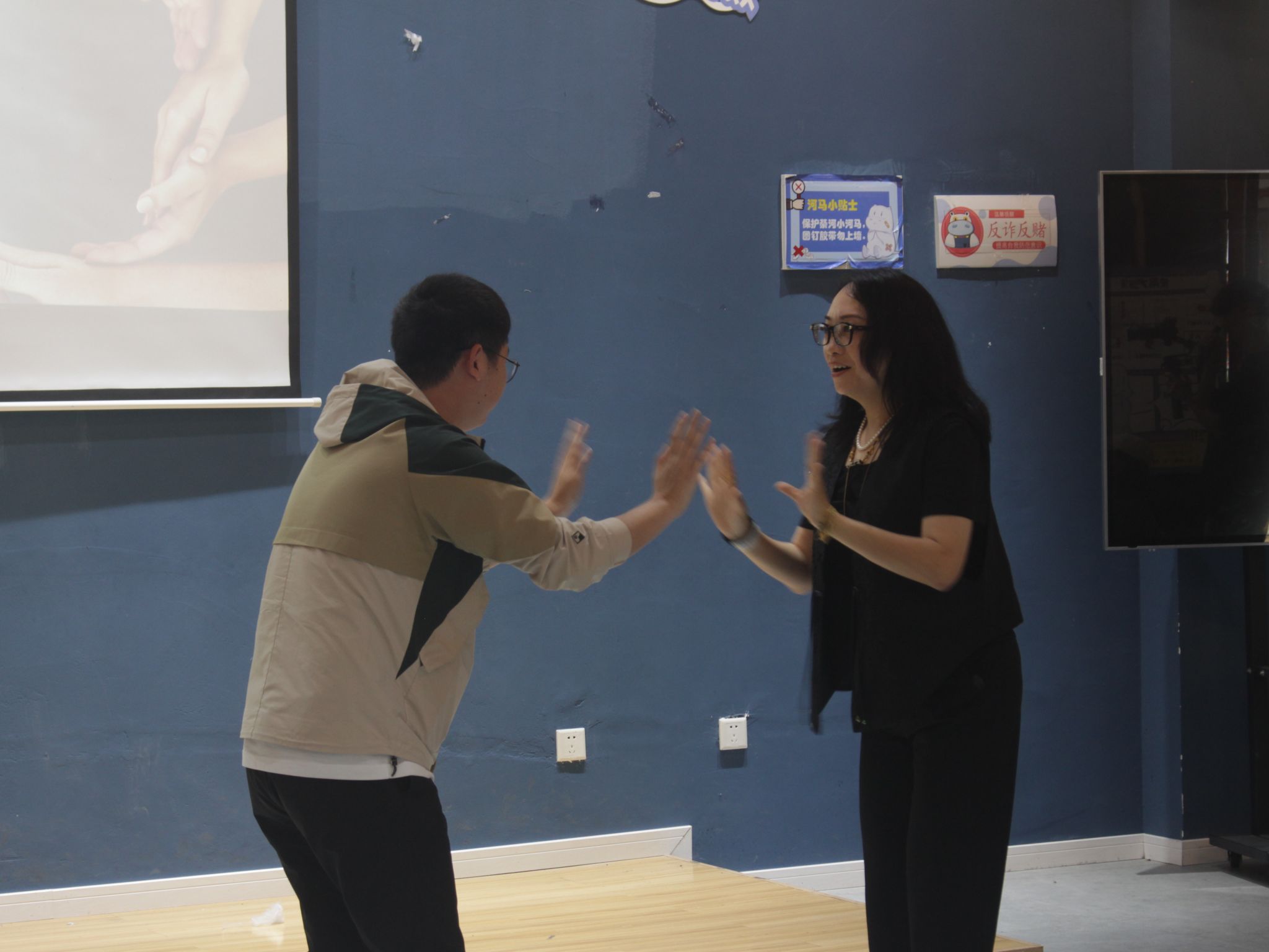 大学生在成长过程中需要不断整合自己的角色。随着年龄的增长和阅历的丰富,大学生会面临越来越多的角色挑战,如学业压力、职业选择、家庭责任等。因此,他们需要在这些角色之间找到平衡,确保自己的心理健康和全面发展,而戏剧空间则为大家提供了一个情绪释放的机会。赵老师通过自己的个人经验与工作经验,指出个体可以通过戏剧空间演练与自己有关的新关系,藉以转变、强化自己的形象,建立自我价值观,透过故事中的隐喻直接与无意识对话、连结自己的内心,释放过不去的情绪和伤痛,达到接纳自己,与自我和解的效果。赵老师详细阐述了角色带来的感受如何促进人际交往。通过扮演不同的角色,青少年可以体验到不同人物的情感和心理状态,从而更好地理解他人,提升自己在人际交往中的敏感度和应对能力。这种角色拓展有助于他们建立健康、和谐的人际关系,对于大学生的成长尤为重要,因而“拓展角色类别”与“增进社会互动与人际关系”“整合自我人格与信念”是戏剧治疗的重要目标。随后,赵老师通过“雕塑接龙”互动游戏活跃了现场氛围,参与者们两两一组通过肢体语言无意识的摆出身体造型,感受拓展人际关系的可能性。