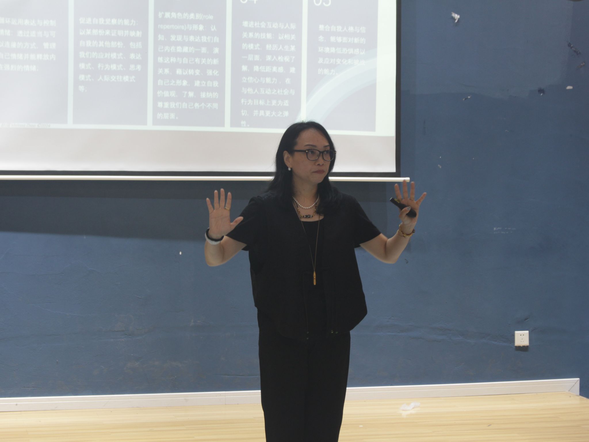 讲座伊始,赵倩老师以“万物皆可玩”引入主题,打开了大家的思路。赵倩老师提出,同样的一件事物或者物品,因为个体或角色的认知不同,因此看待事物的视角也有所不同。戏剧治疗正是如此,它通过“非语言沟通”“体验式学习”“游戏力”等过程,运用“角色扮演”“说故事”“即兴创作”等过程性导向的方法,达到心理的成长和转变。为让大家更具体化的了解戏剧治疗,赵倩老师以“十年怕井绳”为例,从人的成长经验出发,详细讲解了“井绳”与“蛇”之间的投射与联想关系,得出了个体的行为模式是由许多空间与元素组成的结论,引出了“戏剧治疗的目标”这一主题。