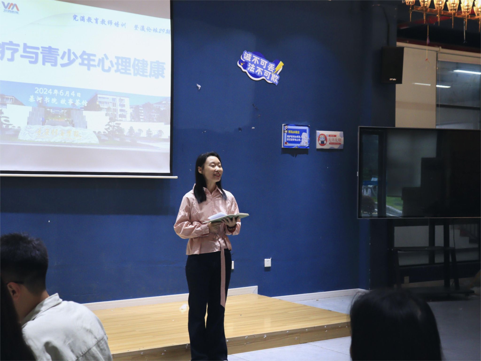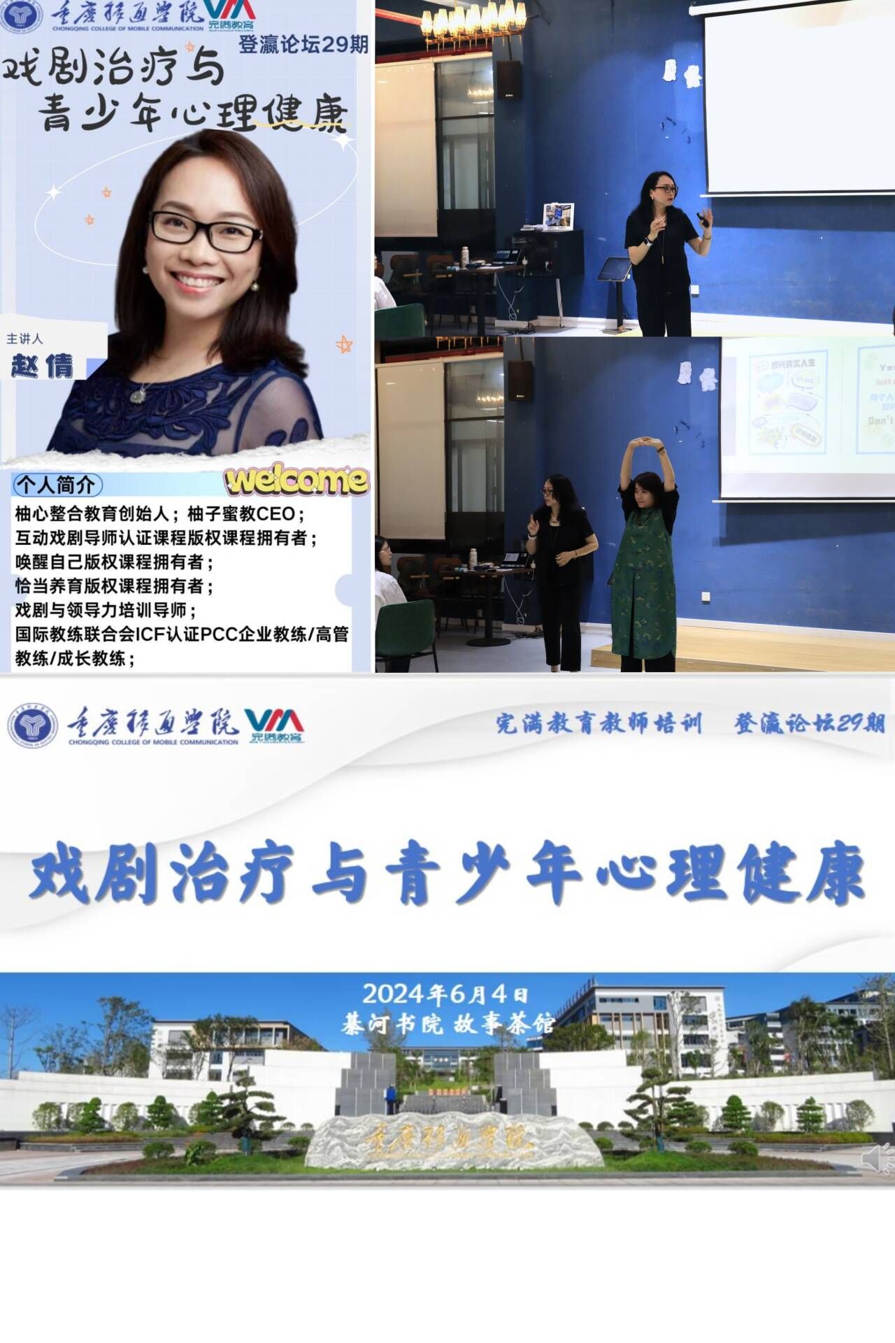 为切实加强我校心理健康教育工作体系建设,提高学工队伍心育工作胜任力,营造积极良好的心理健康氛围,6月4日15:00,由学生处主办,“满·心”学生成长工作室承办的第29期登瀛论坛“戏剧治疗与青少年心理健康”专题讲座在綦河书院东篱·故事茶馆举行。本次讲座邀请到了柚心整合教育创始人、柚子蜜教CEO、戏剧与领导力培训导师、国际认证戏剧治疗职业师赵倩主讲,心理中心副主任林红老师主持,綦江校区专兼职心理教师、辅导员、异科导师等45位老师共同参加。