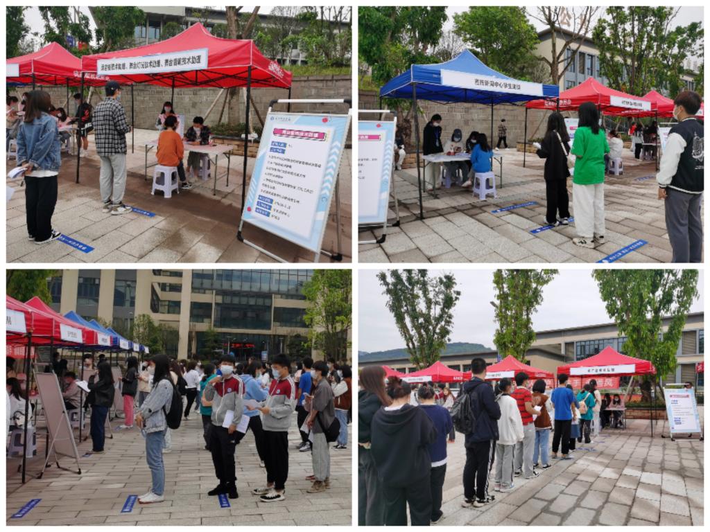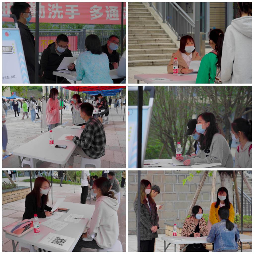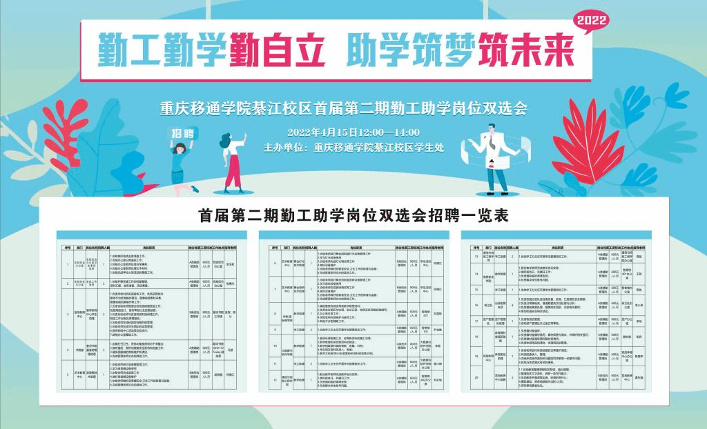 2022年4月15日中午,图书馆广场气氛热烈、秩序井然,綦江校区首届第二期校内勤工助学岗位双选会如期举行。本次双选会由綦江校区学生处承办,共有18个用人单位前来招聘,提供了31个勤工助学岗位,涵盖了辅助管理、综合管理、技术管理等岗位类型,双选会采用公开招聘、平等对话、双向选择的方式,同学们携带简历和课表参加面试,用人单位老师担任面试官与同学们亲切交流,充分沟通。
