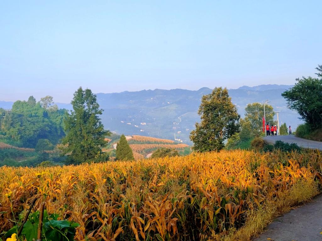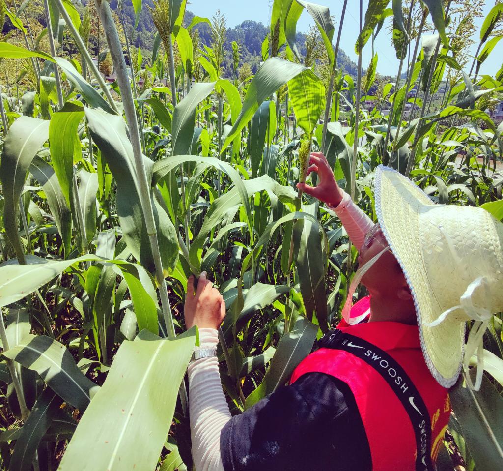 太阳初上,志愿者们通过走访了解到村里引进了一批新的糯米稻种,还在试验阶段。于是,在村民们的带领下来到一片片稻田,稻穗低垂,承载着村民们殷切的期望。志愿者们小心翼翼地踩在田坎上,仔细观察还在实验中的糯米稻,详细记录糯米稻的成长。据村民们讲,新引进的糯米稻不仅产量高而且抗倒伏。实验稻田的旁边是一片高粱地和玉米地,许多玉米都已差不多成熟,放眼望去像一片金色的被褥盖在的大地上。志愿者们深入田间地头,去亲身体会农作物的成长,感受生命气息。
