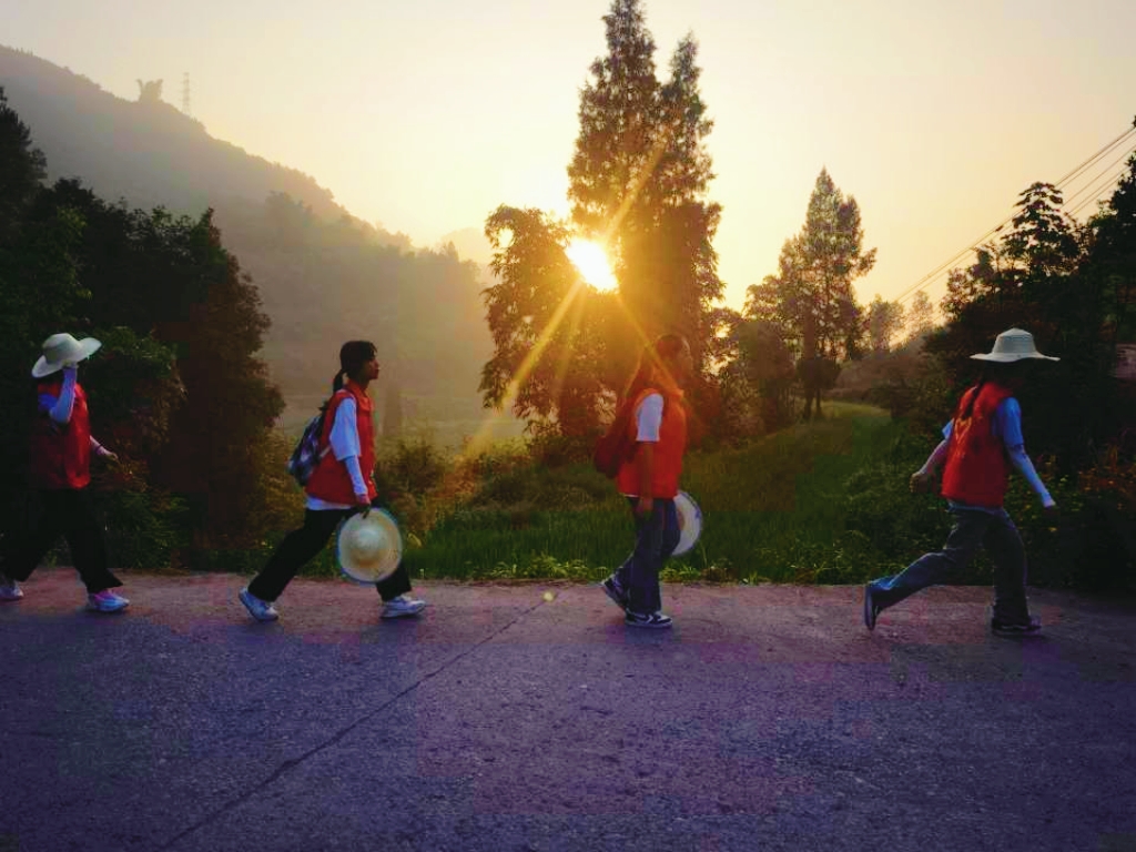 叫醒7月早晨的,是清晨第一缕阳光。天蒙蒙亮,志愿者们早早整顿好,徒步7公里前往双龙村,山路蜿蜒,盘旋而上,穿行在林间,不仅让志愿者们体会到不一样的乡村气息,还让志愿者们看见和感受不一样的乡村生活。走在乡间的小路上,呼吸着不同于城市里干净清新的空气,志愿者们个个精神抖擞,像是七八点钟的太阳,也如乡村振兴大道上的追逐者,充满朝气与生机。