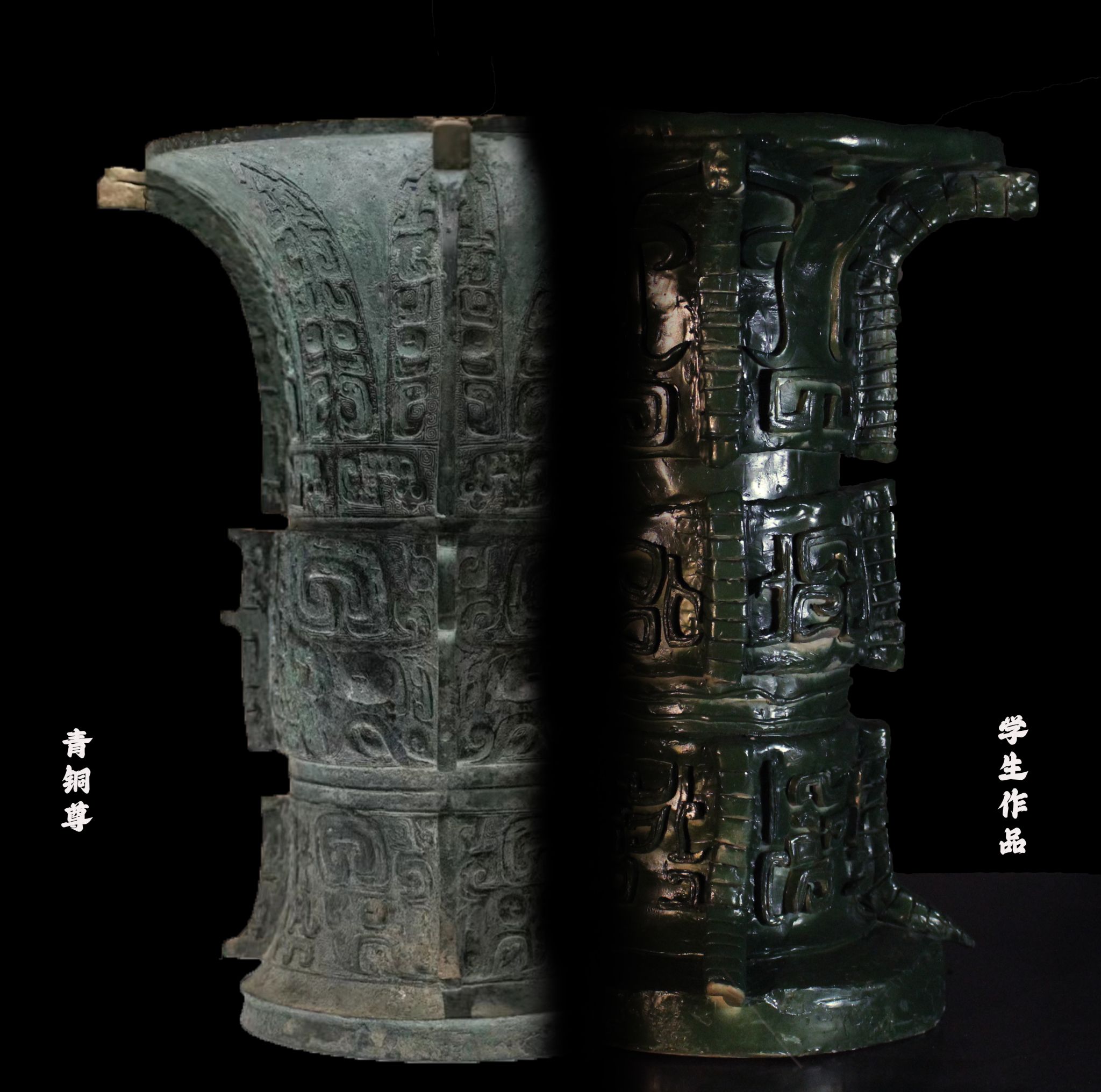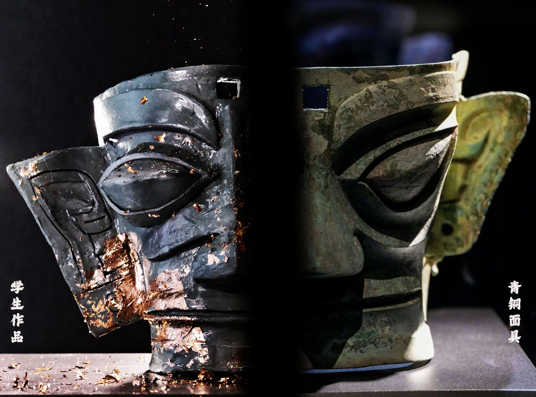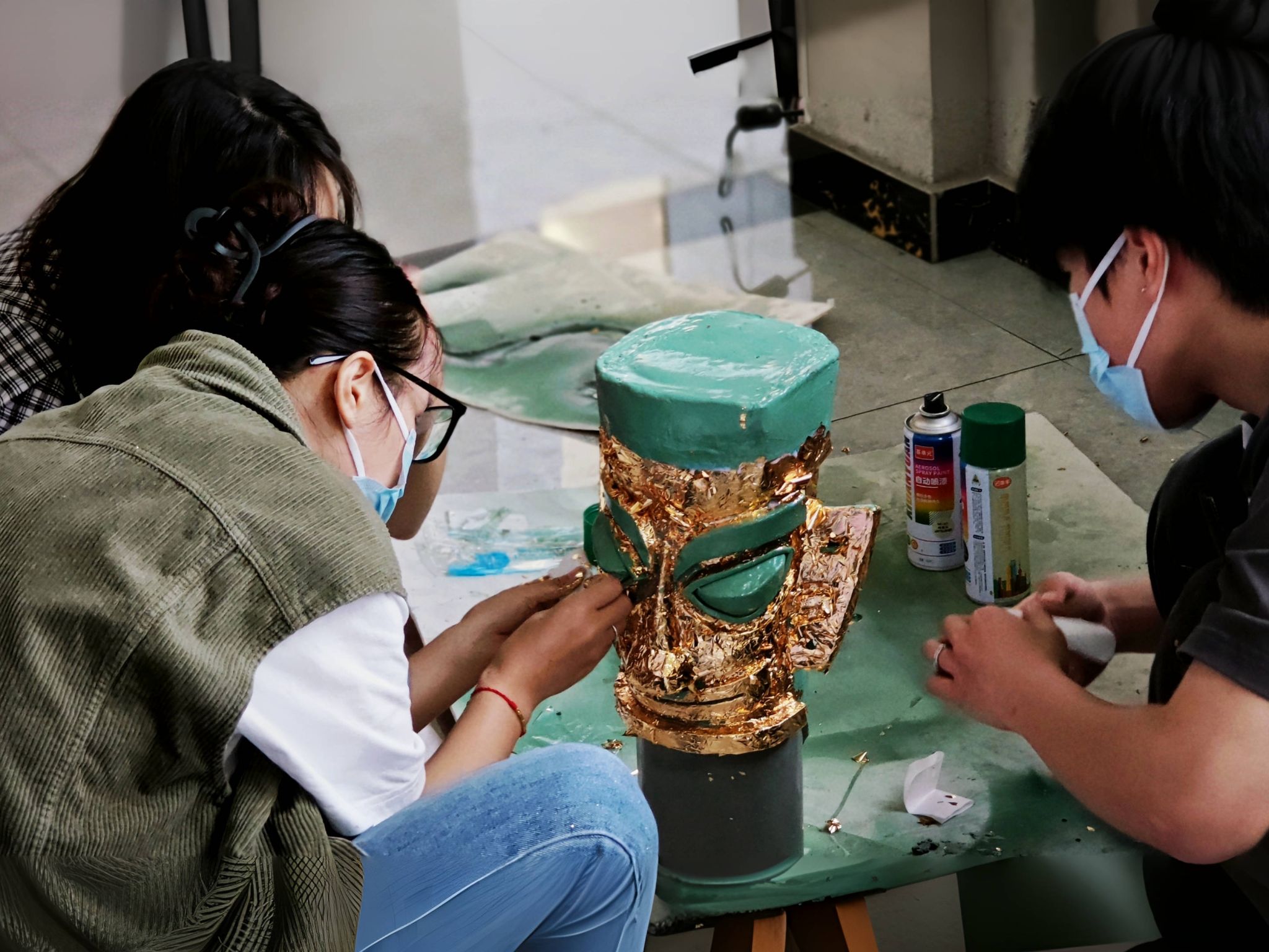 项目开展以来,两位导师带领学生们从零基础出发,通过对文物的刨析讲解,经过比例规划、拆解设计、绘图雕刻、裁剪拼接、油泥造型、打磨抛光、上色定型等25期课程培训,成功复刻出了包含青铜鼎、青铜尊、青铜面具在内的15件青铜文物!