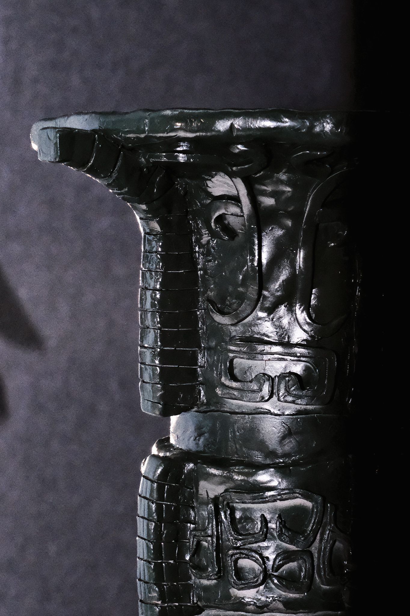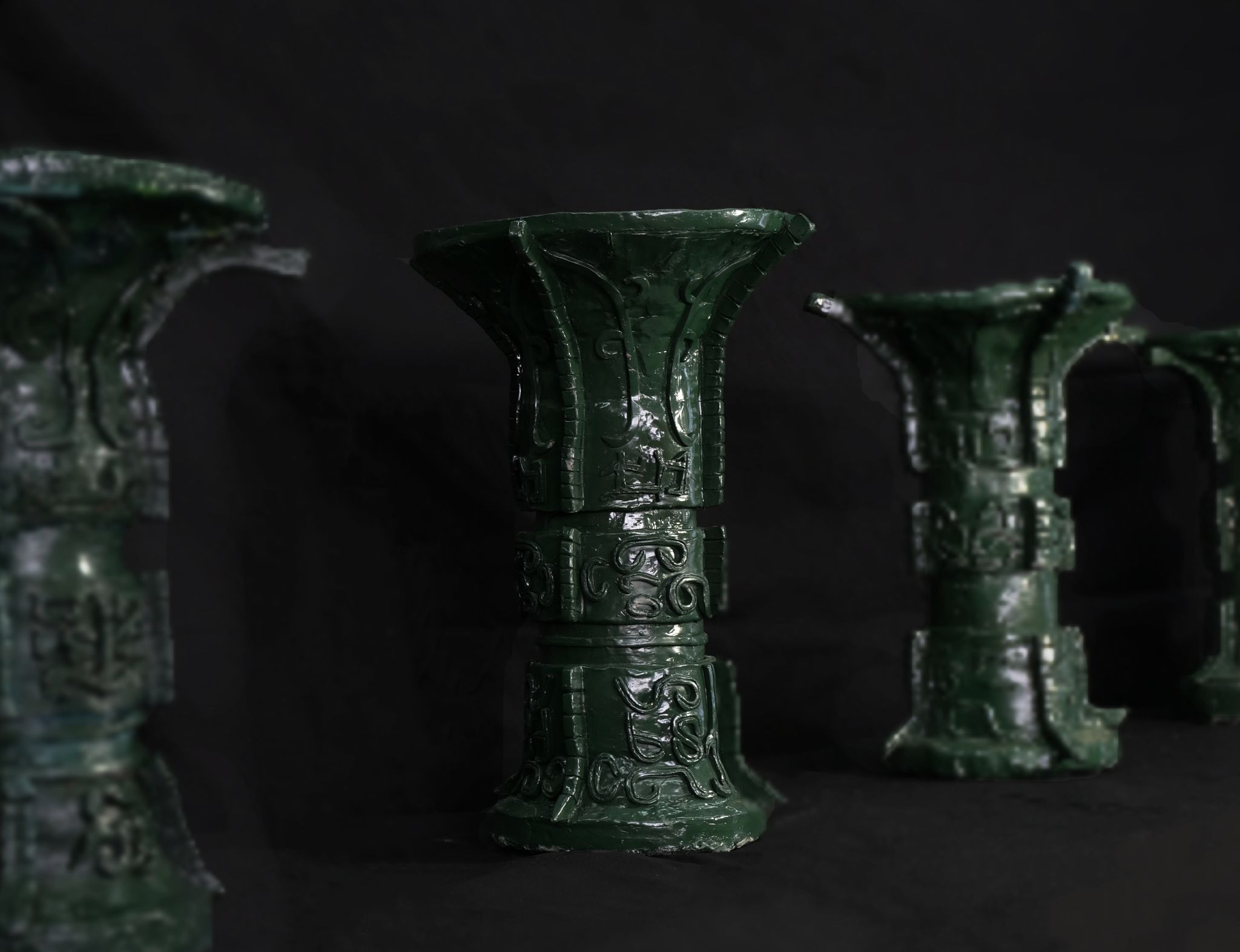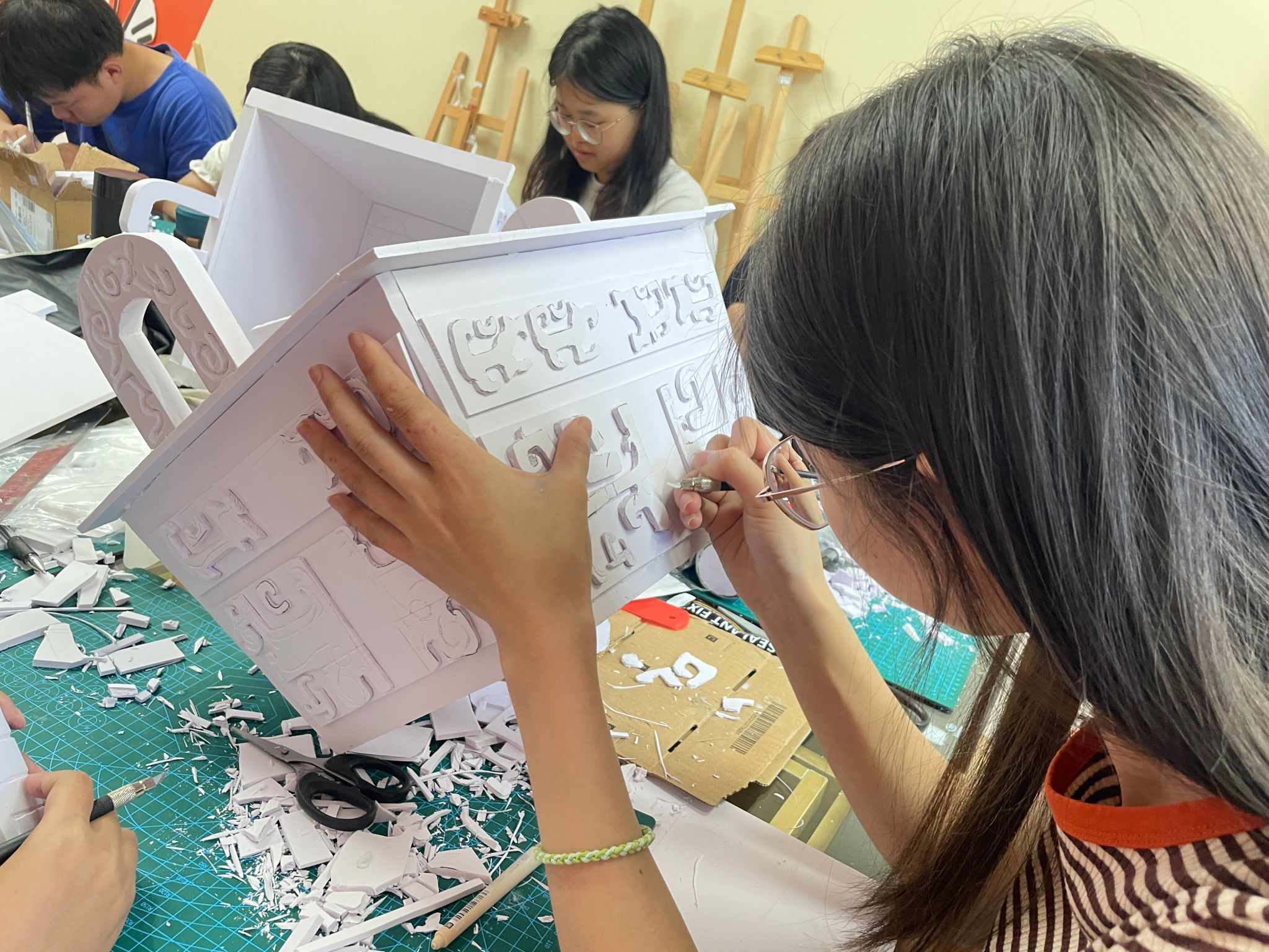 项目开展以来,两位导师带领学生们从零基础出发,通过对文物的刨析讲解,经过比例规划、拆解设计、绘图雕刻、裁剪拼接、油泥造型、打磨抛光、上色定型等25期课程培训,成功复刻出了包含青铜鼎、青铜尊、青铜面具在内的15件青铜文物!