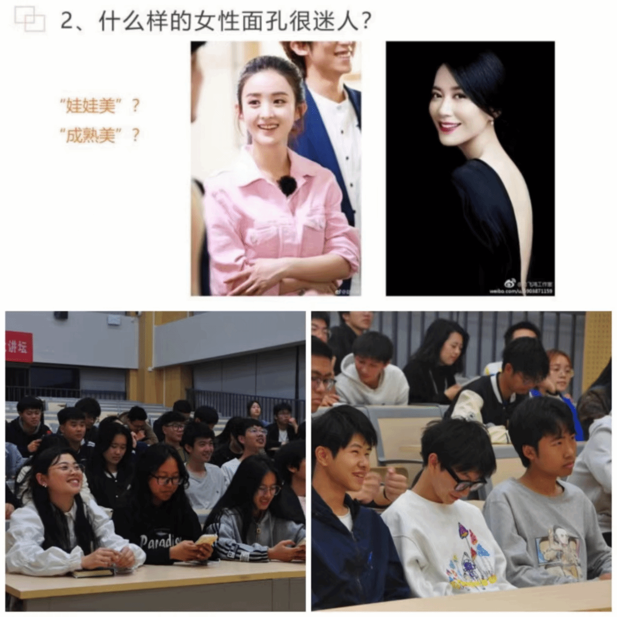 在“颜值即正义么?”版块,涂老师分享了美貌带给我们的红利和代价,以及什么样的男性和女性面孔最迷人,并从进化心理学和文化的角度分析了什么样的女性身材最具有吸引力。研究显示,有45%的男生会选择身材圆润型。以此提醒女孩子们不要一味减肥,健康的状态才是最美的。最后,涂老师还为同学们介绍了一项新的研究,表明比起不漂亮的人和过于漂亮的人,中等漂亮的人更招人喜欢。