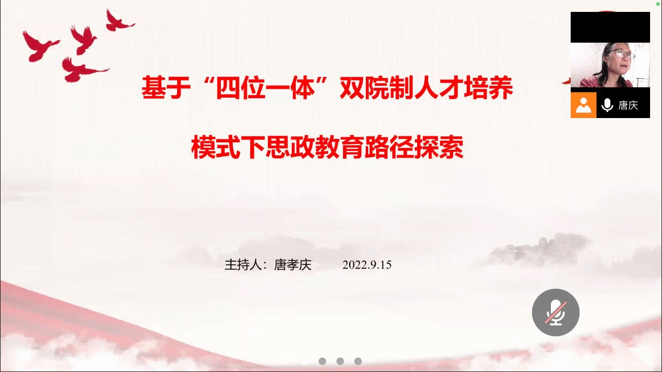 2022年9月15日上午,公共基础教学部思政教学组《基于“四位一体”双院制人才培养模式下思政教育路径探索》学习讨论会圆满结束,思政教学组唐孝庆老师主持会议,思政教学组全体教师参会。