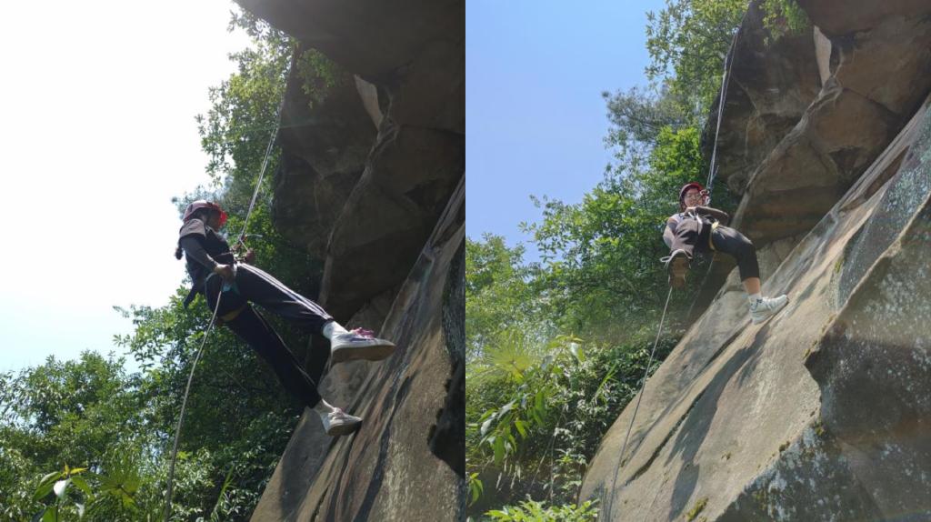 身体是革命的本钱,学习之余,这群女孩们也有广泛的兴趣爱好。她们注重身体锻炼,一起做“刘畊宏女孩”,他们会享受生活,一起共享美食,其中熊芹芹、董佳雪两位同学更是对绳索崖降这类户外运动有着浓厚的兴趣,谈到兴趣从何而生时,她们说道:得益于我校营地教育中心的一次户外崖降体验使她们充分了解并爱上这项活动,营地教育中心的老师们给零基础的同学们做了充足的培训和保护。通过绳索崖降活动,不仅让她们结交了很多相同兴趣的朋友,也使他们从繁琐的学习中找到放松的方式,与大自然亲密接触后,他们变得更加勇敢,敢于突破自己,敢于一跃而下,也能勇攀高峰。