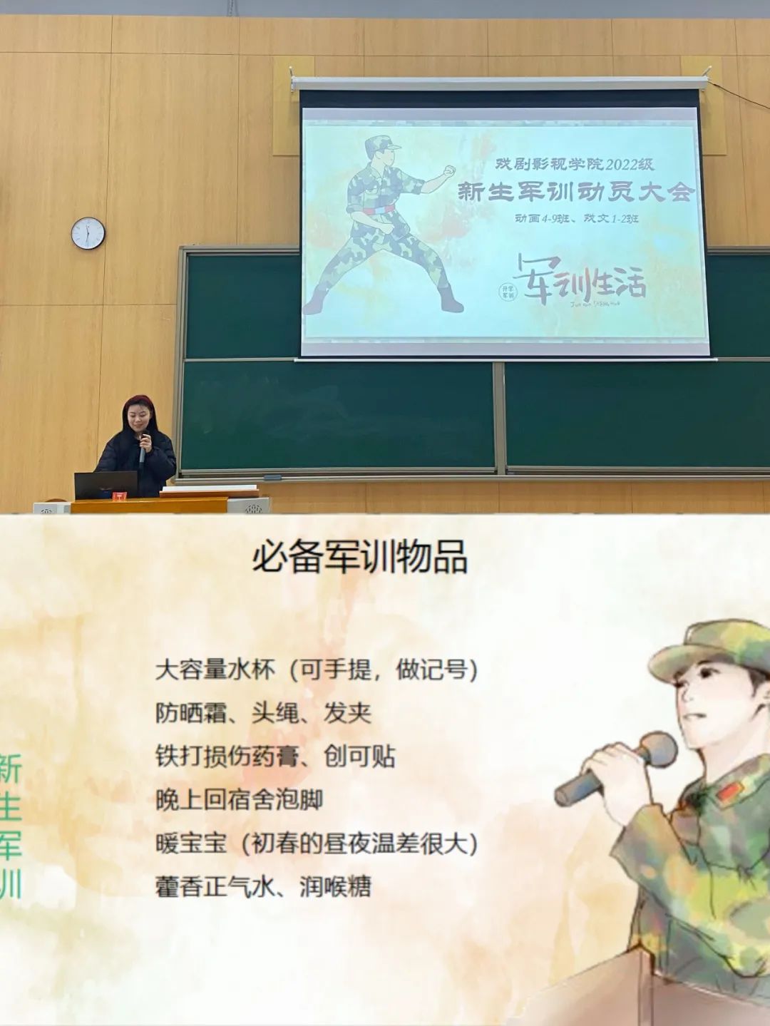 无军训,不青春。军训动员大会紧随开学第一课其后。作为新时代青年,我两位辅导员老师强调“作为当代青年大学生,同学们要牢记习近平总书记的殷殷嘱托,听党话、跟党走,胸怀忧国忧民之心、爱国爱民知情,不辜负伟大时代。”通过军事训练强化内功、磨练意志,是当代大学生的必修课。