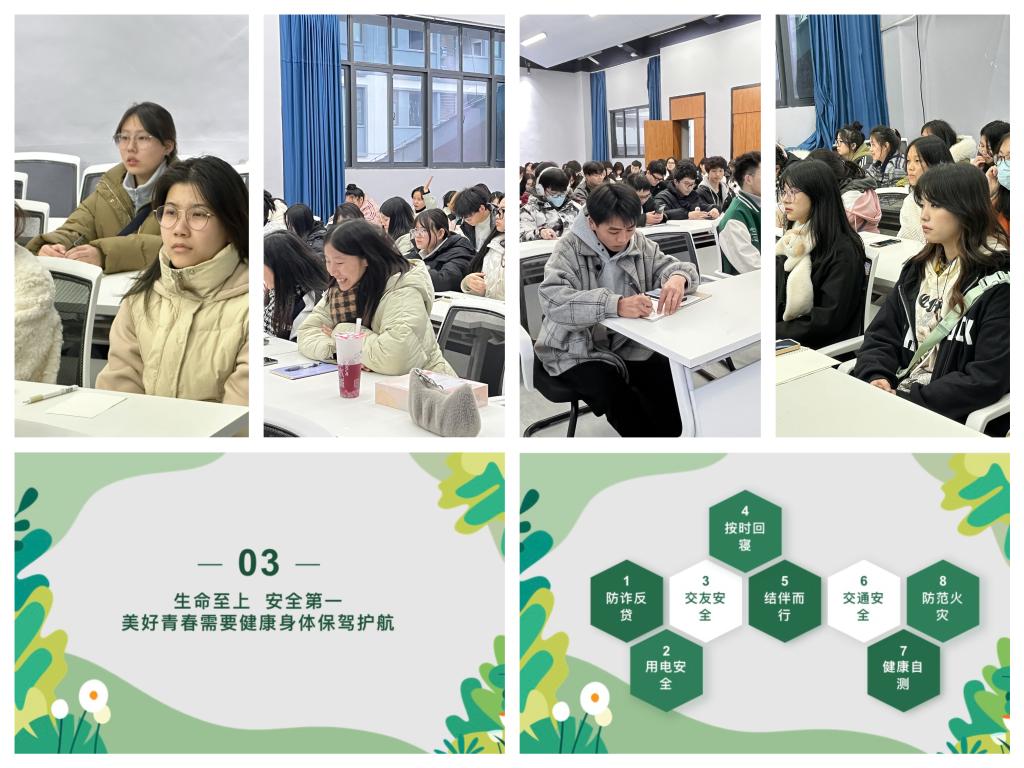 曾玉娇老师从学期规划、行为养成和安全须知三个维度为大家充电续航,科学规划、自律自主、自我养护是大学生必须要知道并学会的事,防诈反贷、用电安全、交友安全、网络安全、健康自测等方方面面都要有防范意识。纪律与规范、计划与执行、刻苦与坚持、挑战与机遇、感恩与奉献......老师时而穿插的经典小故事也引发大家内心深度的反省和思考,相信此次开学第一课定能给同学们警醒,信心满满地迎接新学期,做自己大学生活的主宰。