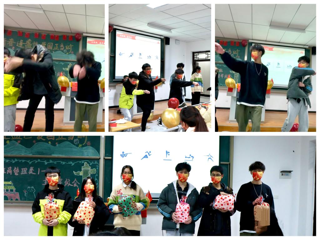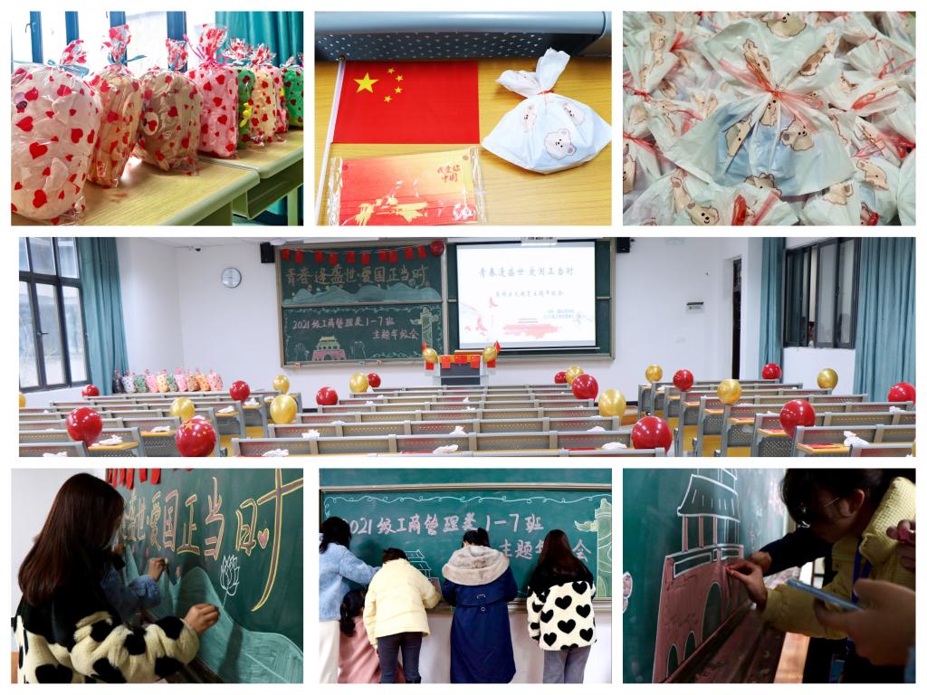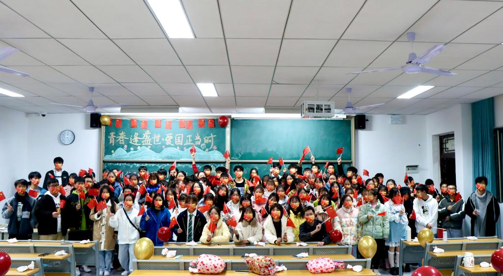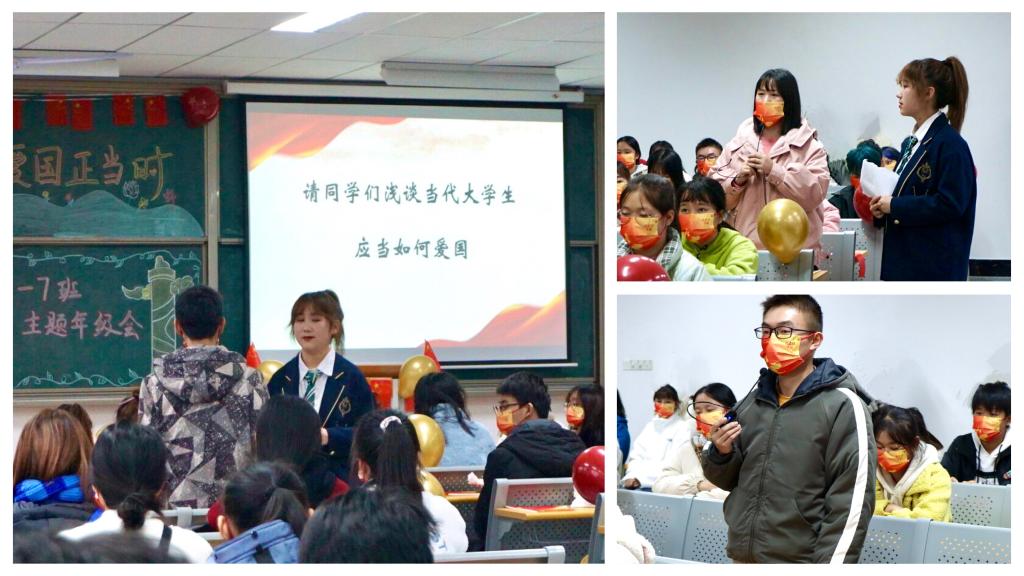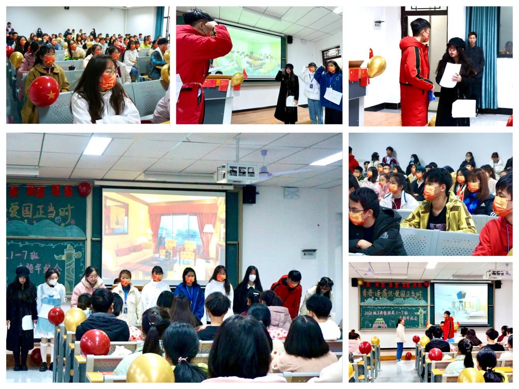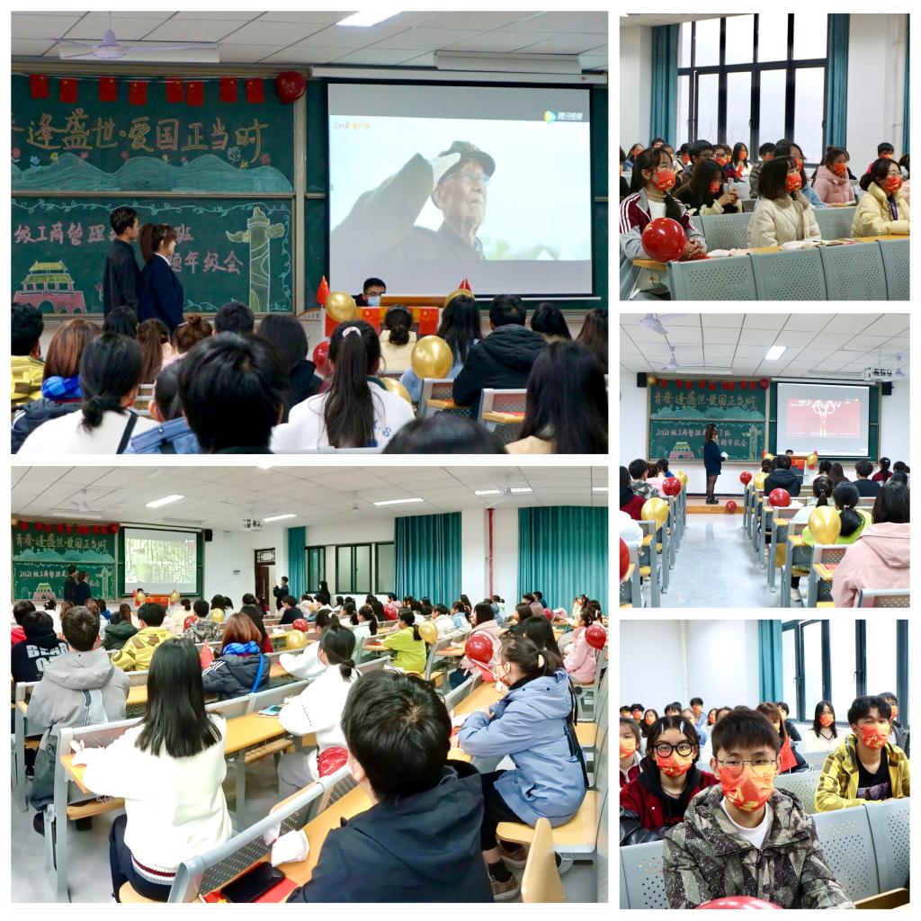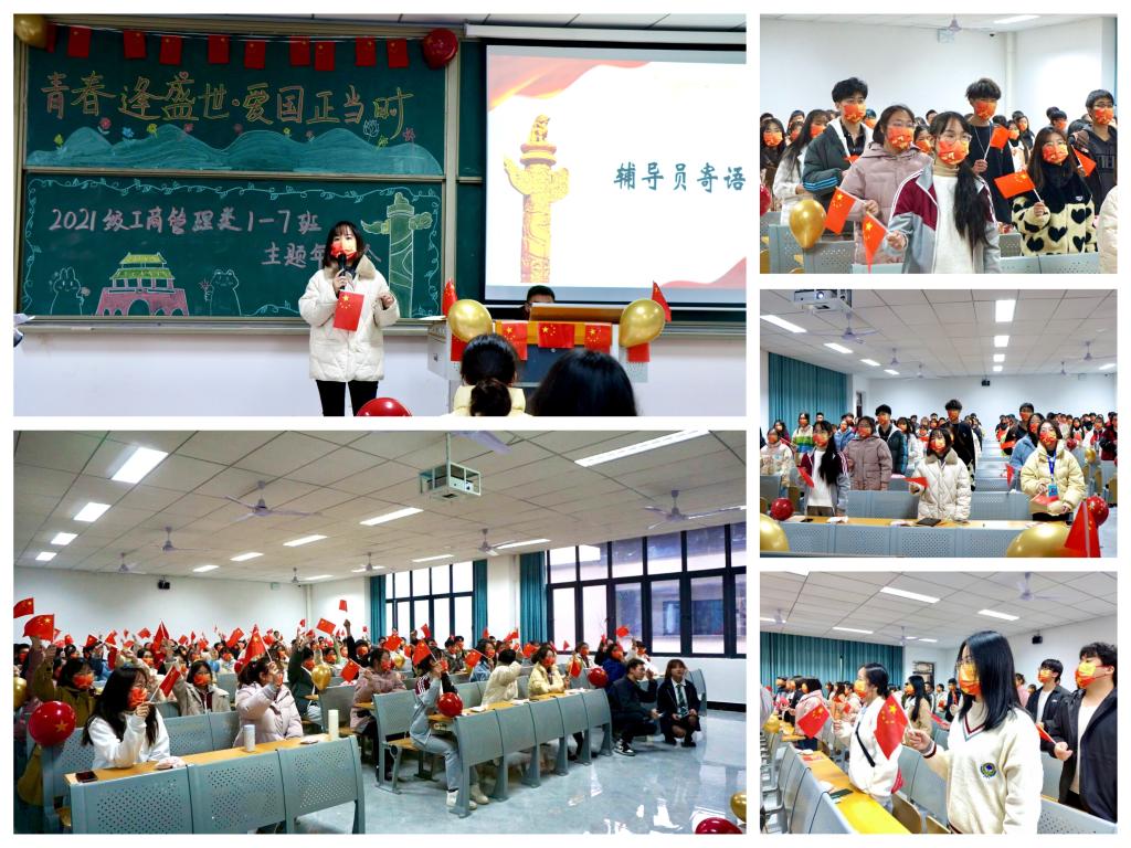 弘扬盛世强国,开化青年教育。为更好贯彻爱党爱国精神,深化爱国主题教育,淬炼•国际商学院2021级工商管理类1-7班于2021年11月17日在勇者楼207教室开展了“青春逢盛世·爱国正当时”的主题年级会。为响应国家疫情防控相关要求,本次年级会采用“线上+线下”相结合的模式,全体同学共同参与。于线下为到场同学准备了防疫口罩和小“福袋”作为小礼物,同时进行线上书院直播。