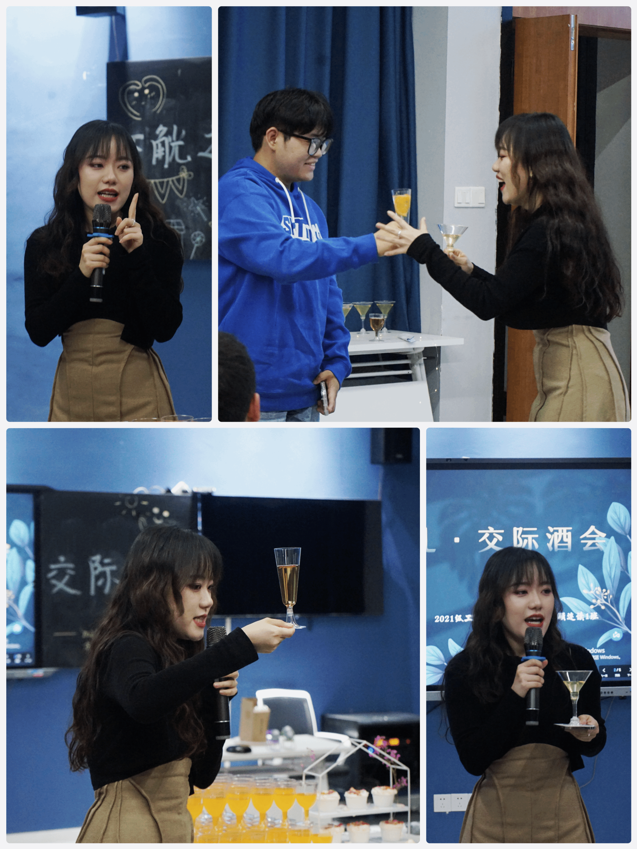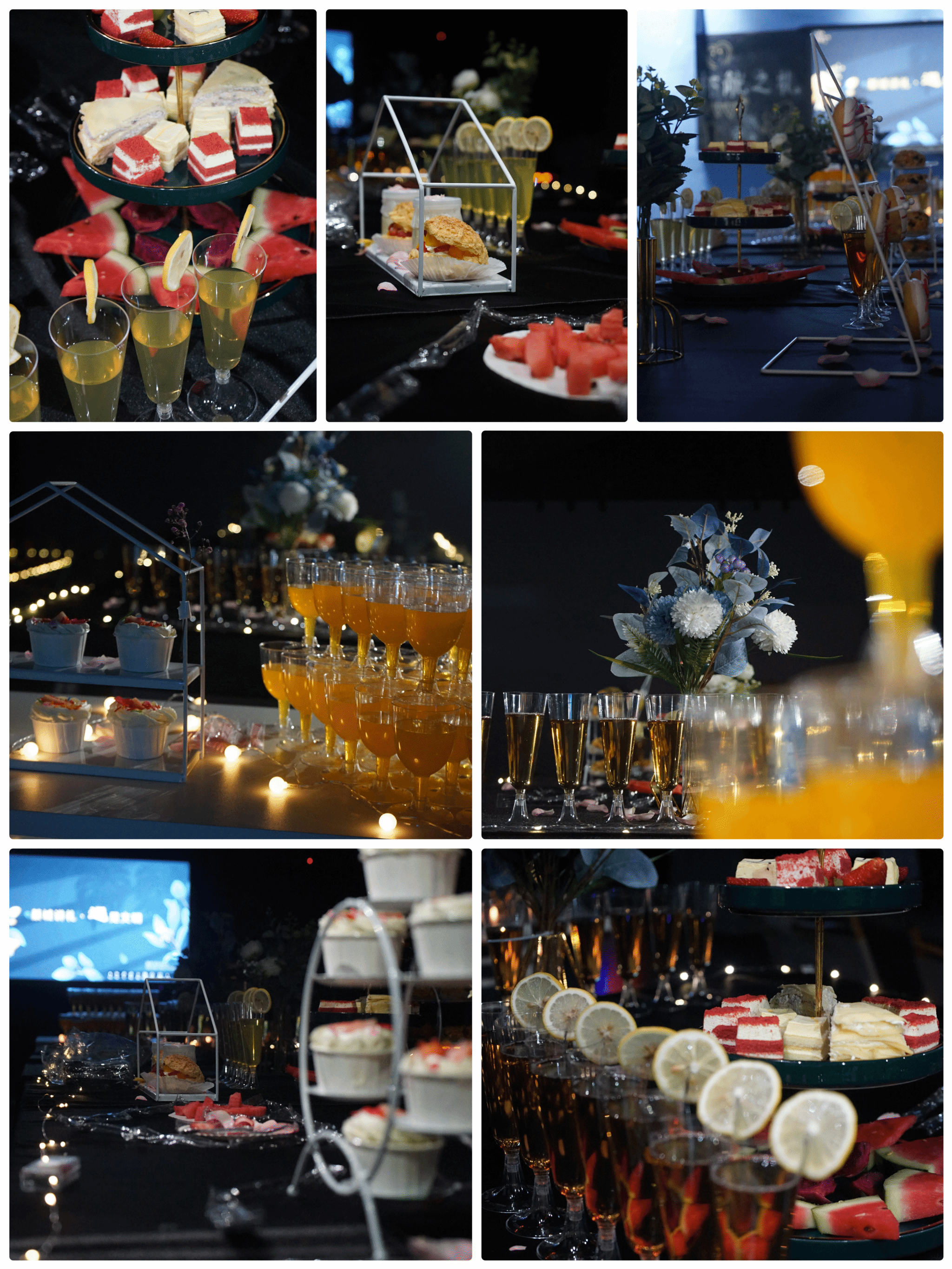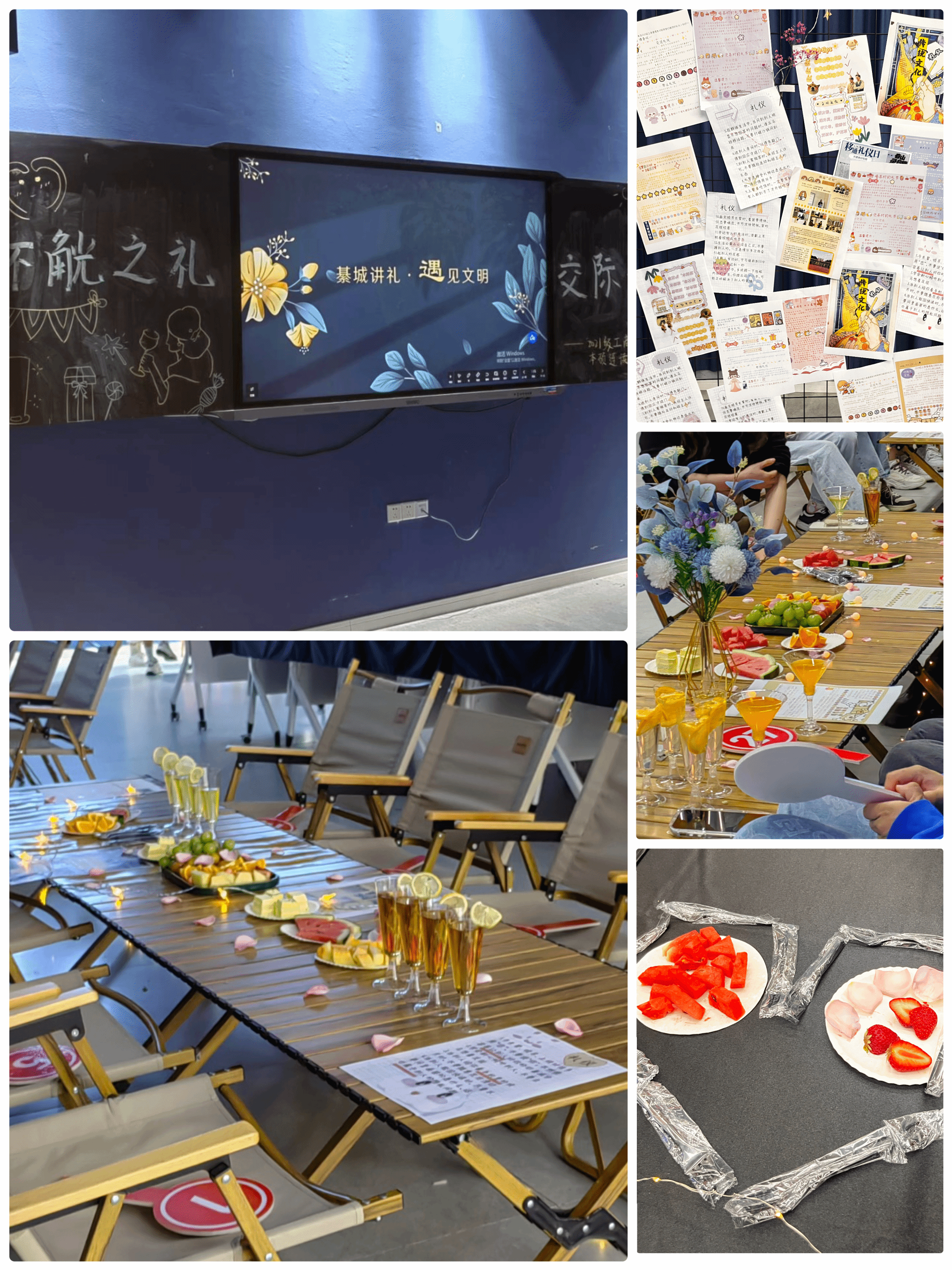 瓶瓶有故事,杯杯有情怀。酒会现场铺以鲜花,舒缓的音乐,具有氛围感的灯光,无一不使人沉浸。日咖夜酒,日落微醺,大长桌、签到墙、桌花、甜品……搭配精美的场地布置,惬意休闲的感觉令人陶醉。宾客进入酒会起初,那一张张排列整齐、内涵丰富的礼仪作品映入眼帘,其中承载的不仅仅是同学们对于礼仪的了解,更多的是能影响身边的人对礼仪的重视。宾客精心打扮,盛装出席,人与景的互动,动与静的结合,都是对本场酒会致以最具礼仪的“浪漫仪式感”。