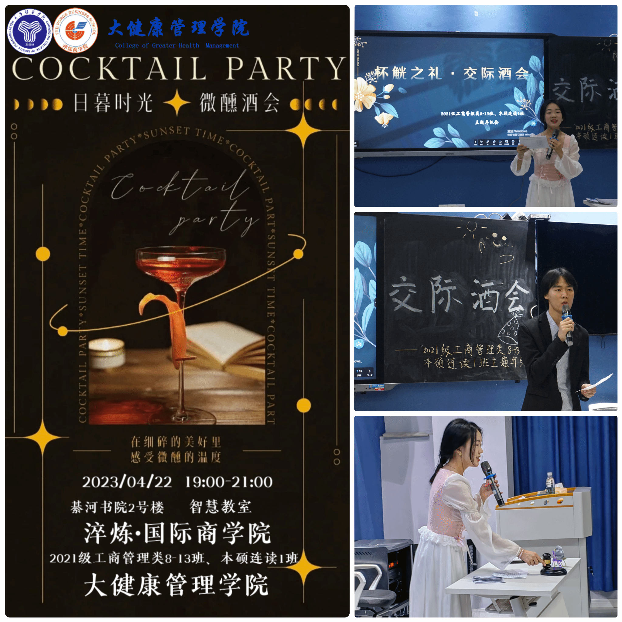 古有言:“不学礼,无不立”,礼承古言,载以湛湛。为让同学们领悟礼仪的深刻内涵,淬炼·国际商学院2021级工商管理类8-13班、本硕连读1班于4月22日19:00在智慧教室开展“杯觥之礼·交际酒会”主题年级会。本次年级会依托酒会形式,在宣传文明礼仪文化的同时,提升同学们对商务礼仪的认知,让同学们感受商务礼仪的独特魅力。