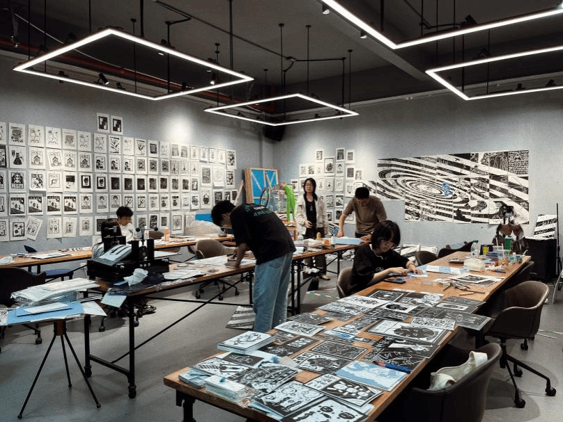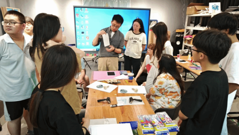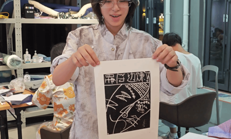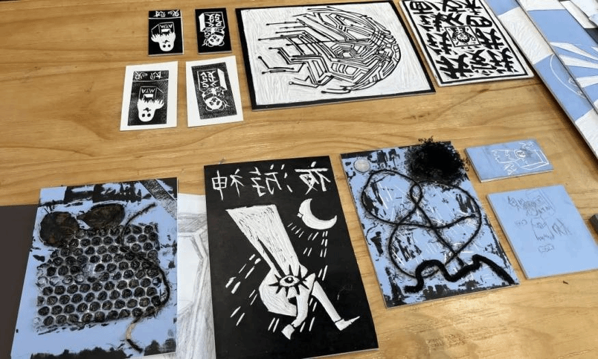 5月19日,工坊创作实践环节在瀛溪书院弦宇宙正式启动。在王琎和袁理老师的悉心指导下,同学们逐渐掌握了版画的制作流程及其注意事项,并成功完成了自己的第一幅版画作品。此后,按照活动计划,同学们陆续完成了科幻甲马创作、民间甲马创作、“瀛洲系”科幻版画共创作品以及版画文创作品的制作。