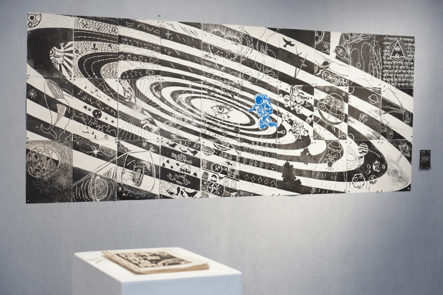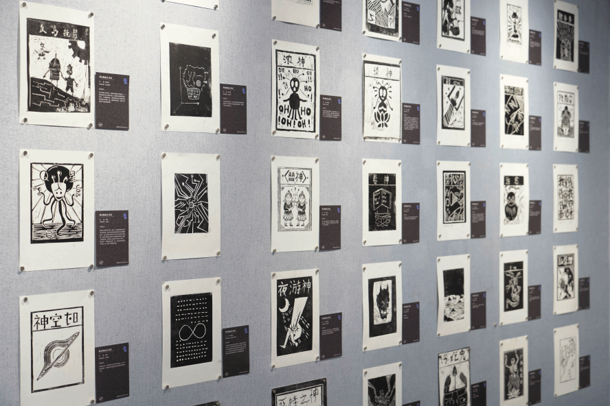 本次展览由科幻甲马、“瀛洲系”科幻共创、“宇宙探索指南”手工书、科幻版画文创和科幻版画装置作品五个部分构成,另外现场还设置版画体验区和影像区,影像内容是瀛洲科幻学院教师李春阳制作拍摄的“科幻版画工坊”记录片。