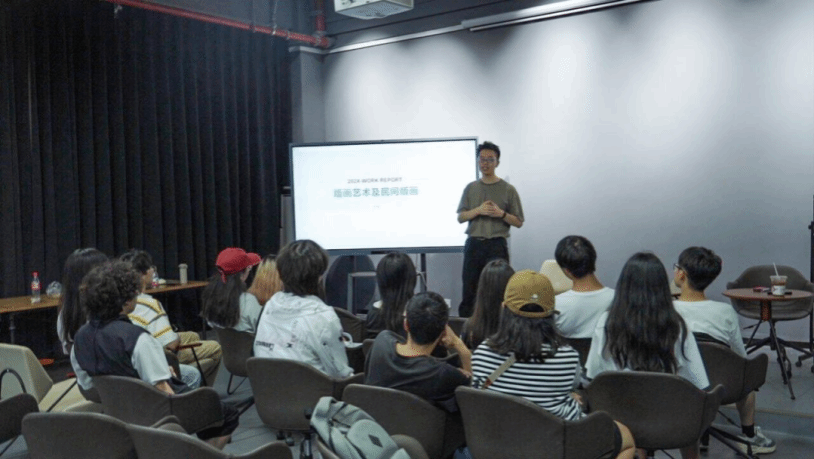 当晚,王琎老师在重庆移通学院瀛溪书院弦宇宙空间举办了“版画艺术及民间美术的当代思考”讲座。讲座中,王老师全面介绍了版画的历史、工艺,并深入探讨了中国民间版画的文创价值。讲座结束后,他还详细发布了此次活动中同学们将要完成的作品要求。此外,袁理老师也在创作和构思的层面为同学们提供了宝贵的指导,帮助他们开启自己的作品创作之旅。