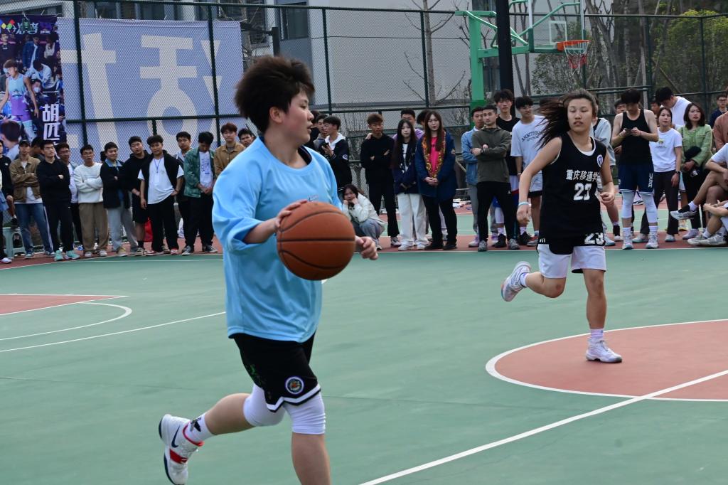 接下来,在众人的翘首以盼下,场上开启了紧张刺激的1v1单挑赛,此时此刻,篮球在参赛选手的手中不断交替,逐渐形成了“乱花渐欲迷人眼”之势,选手们实力强劲,加油呐喊声因为选手们激烈的battle只增不减。都说不会滑翔伞的体育老师不是一名合格的篮球教练,专长滑翔伞的秦晴老师,带着球突围而来,悄悄告诉大家他还教同学们篮球哦~