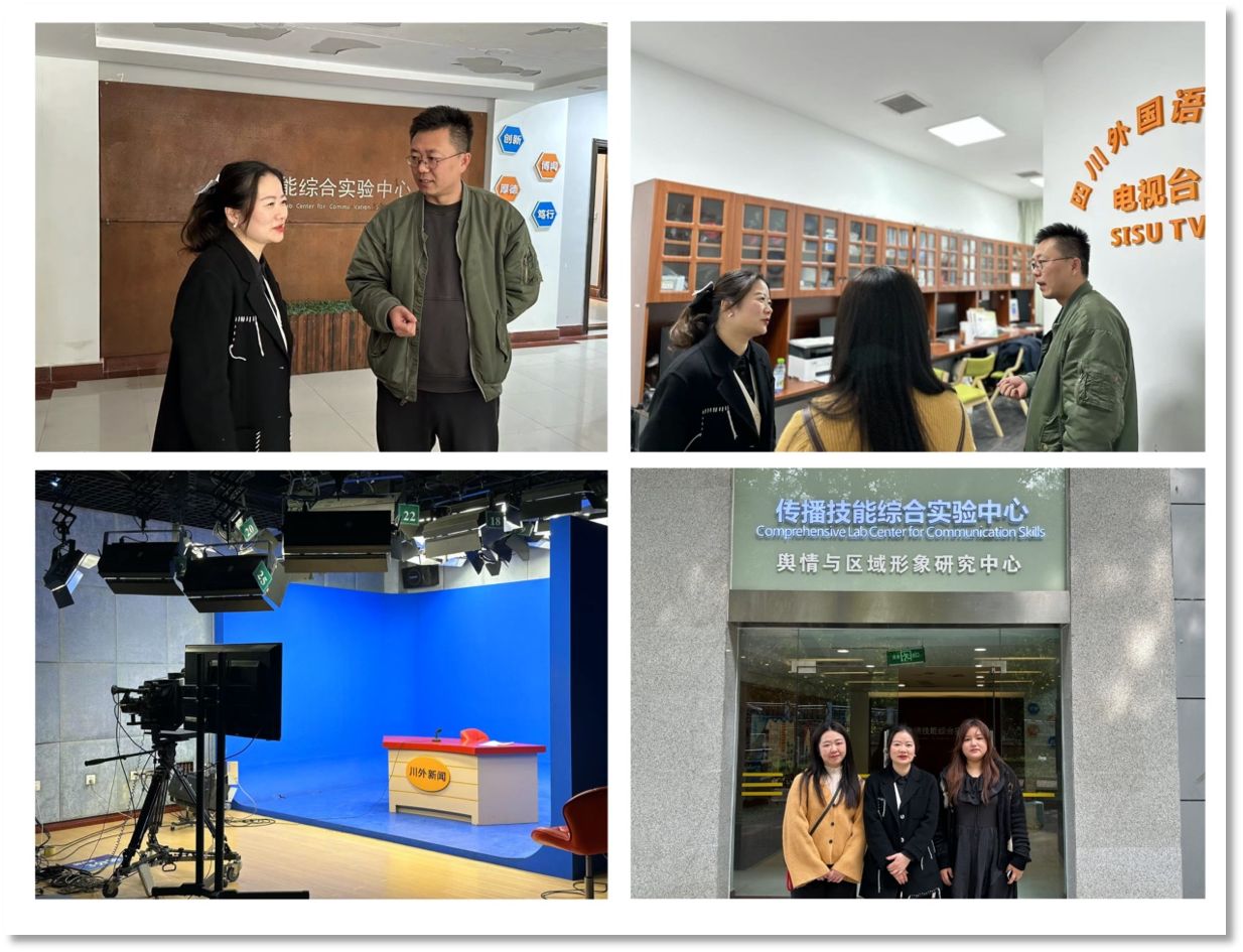 第一站,王芳副院长一行前往四川外国语学院新闻传播学院进行交流学习。在新闻传播学院高志彬老师带领下,参观了传播技能综合实验中心,包括新闻演播厅、学生实践作品、迷你电视台、学生演播彩排以及录音室等。参与考察交流的老师们围绕推动实验室运行管理、组织模式、科研方向、人才团队、成果转化等方面进行深入交流。同时,参观实验室的过程中,高志彬老师还介绍了实验室的设计包括场地选择、音质设计、隔声与隔振设计等,讲解了实验室建设的技术和理论。王芳副院长表示要多向公办院校学习实验室建设经验,可以帮助提升戏剧影视学院实验室建设盲区,创新体制机制,不断完善建设模式。
