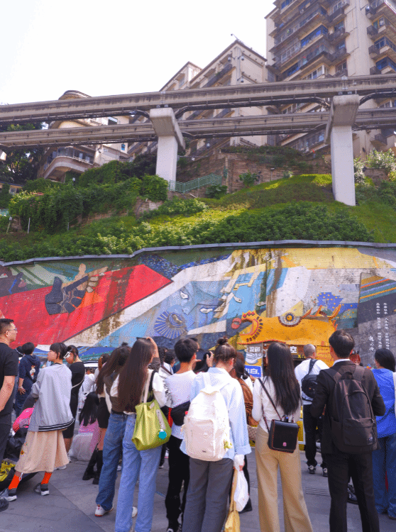 当天下午三点,同学们来到李子坝轨道站上方的鹅岭二厂文创公园,并走访了电影《从你的全世界路过》的拍摄地点。尽管这部电影已经上映多年,但随着李子坝轨道站进一步走红,作为民国时期中央银行的印刷厂,二厂文创公园也成为了旅游的热门地。民国时期遗留的工业氛围和现代艺术在这里得到了奇妙的融合,这让同学们体验到了全新的旅游生态。