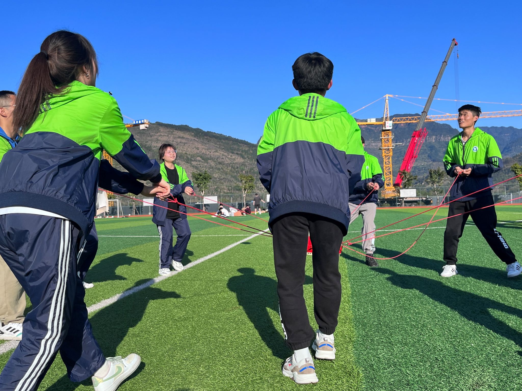“蛟龙出海”:队员们需肩并肩站成一横排,将相邻队友的脚踝绑在一起,最后一起从起点跑到终点。队员们积极配合练习,在队长“一迈左脚,二迈右脚”的口令下,在一次又一次地试错后,每个人找到固定步伐距离和固定步幅的频率,最终大家一起冲过终点,齐心协力完成任务。该项目靠队员之间相互配合、相互鼓励中完成了,让大家对团队合作精神有了深刻的理解,增进了彼此友谊,提高团队意识,认识到团队合作的重要性,才能让队员们站得更高,走得更远。