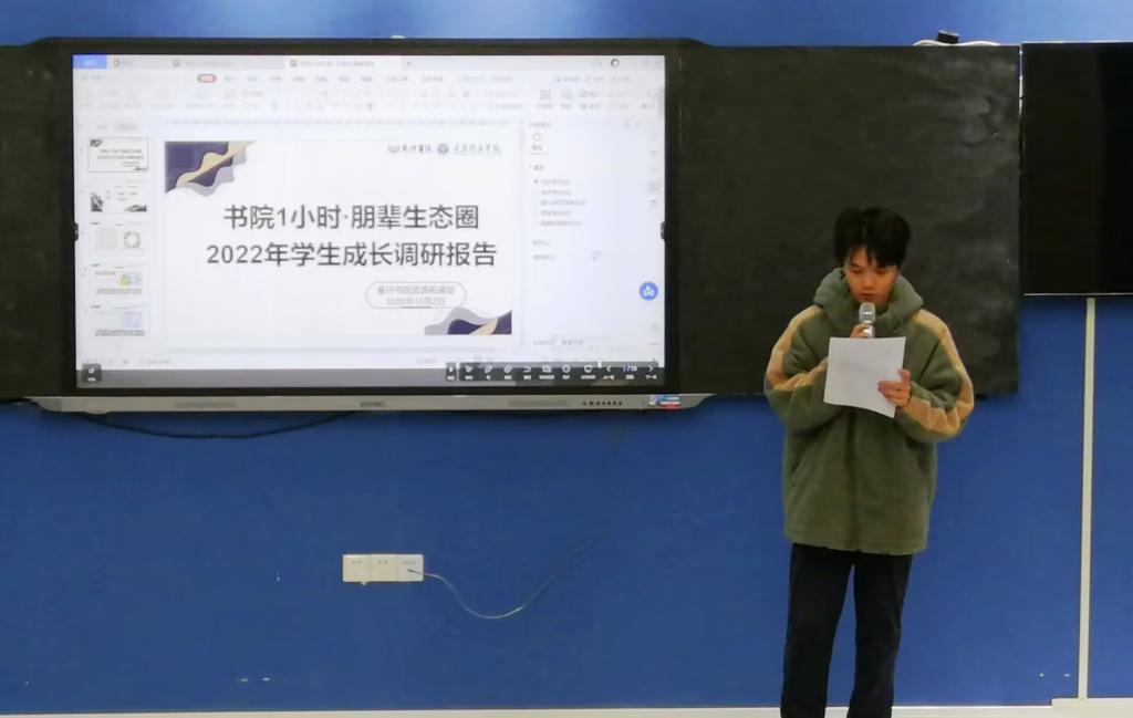 大会第一项,由綦河书院资源拓展部干事田峻楠汇报2022学年綦河书院“书院1小时·朋辈生态圈”2022学年学生成长报告,从他的汇报中,我们看到了过去一学年里书院学子的成长轨迹,看到了各角师生团队的辛勤付出,也看到了书院学子的成长过程中的不足与问题,还看到了綦河书院对学子成长的满满期待。