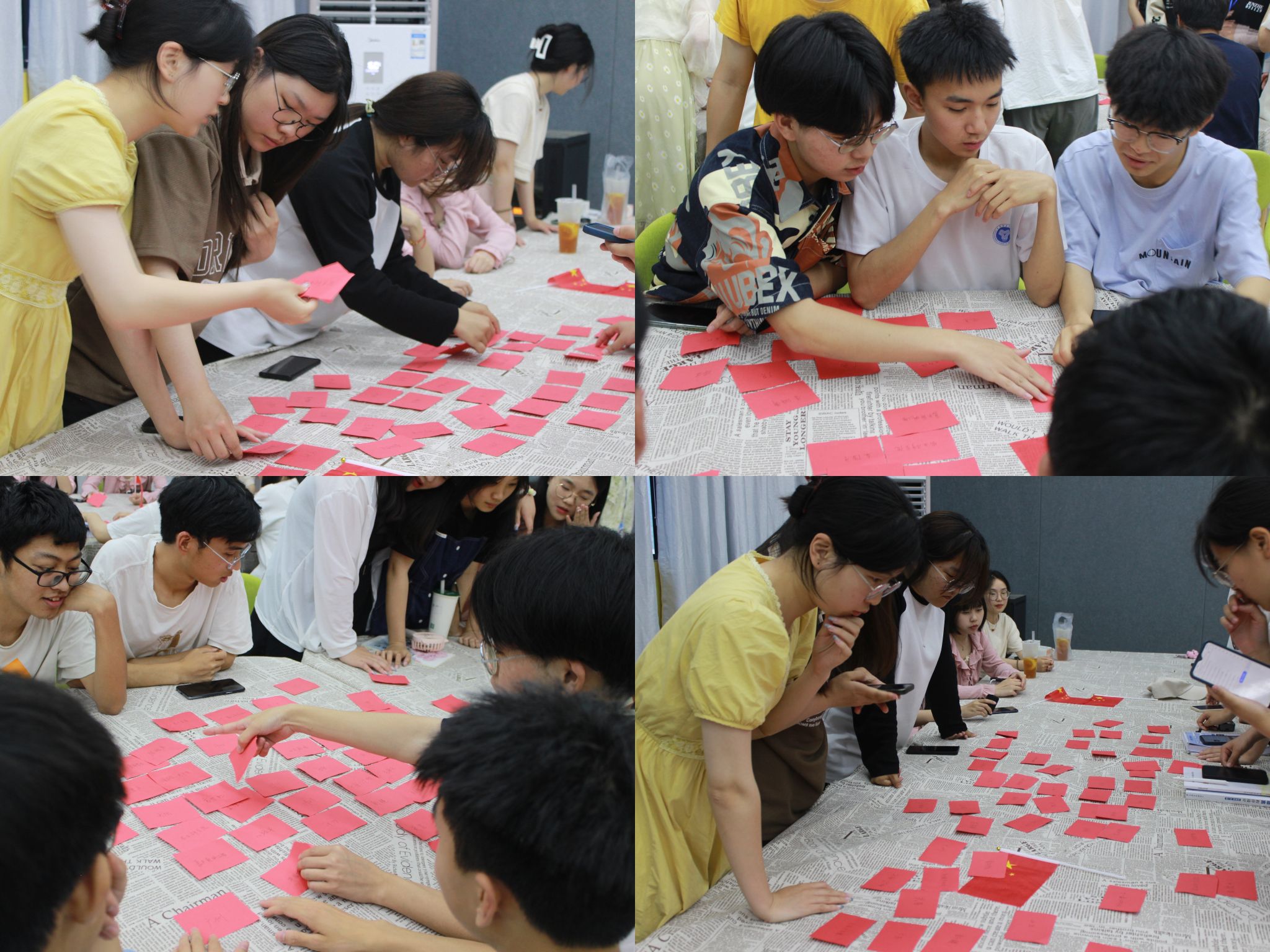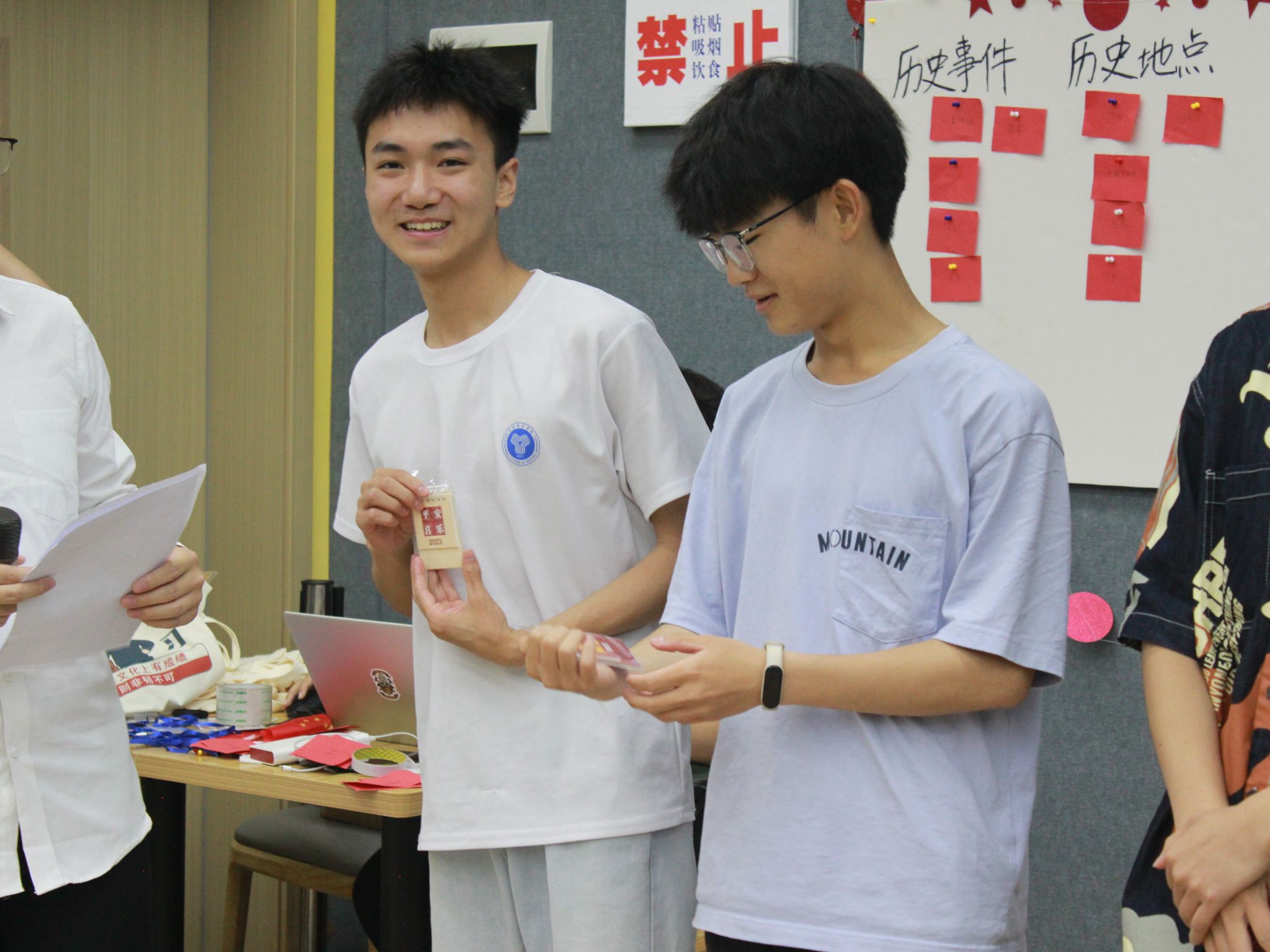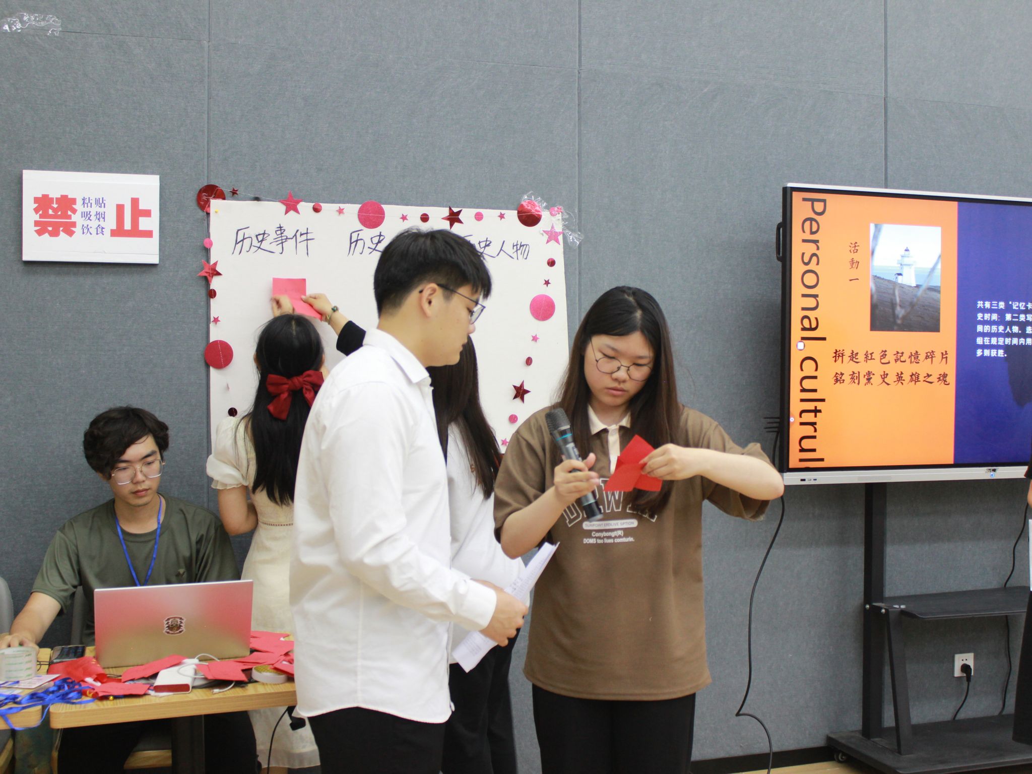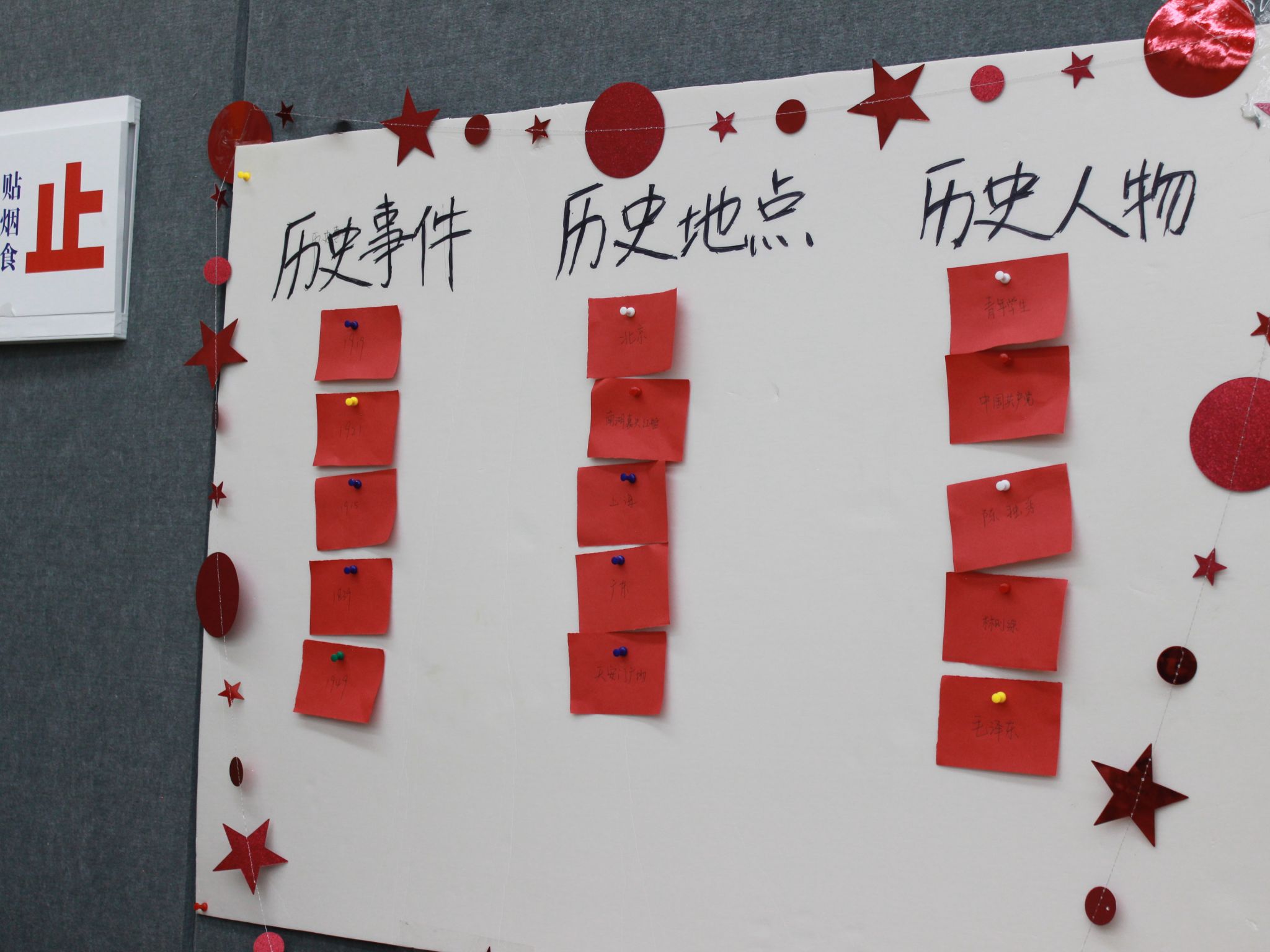 历史是最好的教科书,党史是最好的营养剂。100年来,我们党筚路蓝缕、披荆斩棘,团结带领中国人民建立了伟大的新中国。在这过程中,无数先辈英烈和仁人志士抛头颅、洒热血,燃烧自己的生命,照亮了国家和民族的前程。于是本次活动采取趣味游戏的形式,准备了三类“记忆卡”上写着不同的历史时间、地点、人物。同学们将比赛在规定时间内谁用三种卡片拼出的正确的历史事件最多。只见同学热火朝天的开始了拼接,一张张红色小卡片,连接的是一部部血泪的中国党史,传递的是同学们对英烈的深切缅怀,对新中国成未来的美好展望。