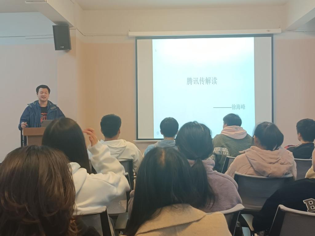 第三位是来自大数据与软件学院2021级软件工程6班的许海峰同学,他为同学们解读了腾讯传。在他的解读中,同学们了解到了一个不一样的腾讯,他说“腾讯是一个既懂得抓住机遇,勇于挑战的企业,但是也有不好的地方需要改进,文明应该在批判中吸取精华去其糟粕”。这也告诫了同学们在前进的道路上,不管我们有多么成功,也要坚持自己的初心,为国家、为社会、为人类做更大贡献。