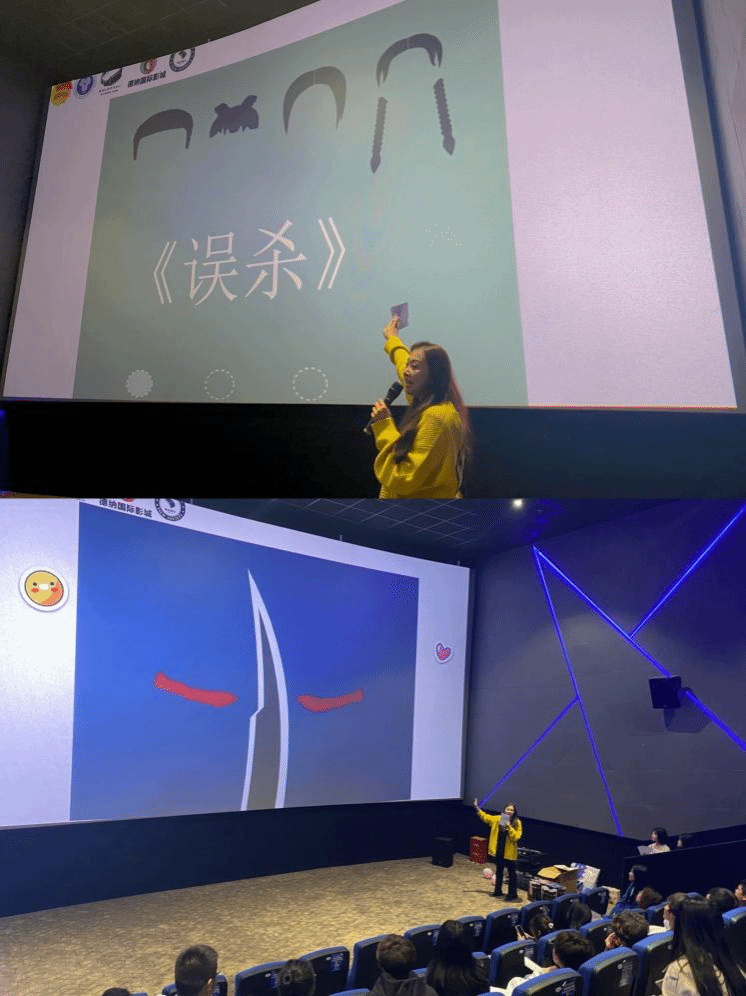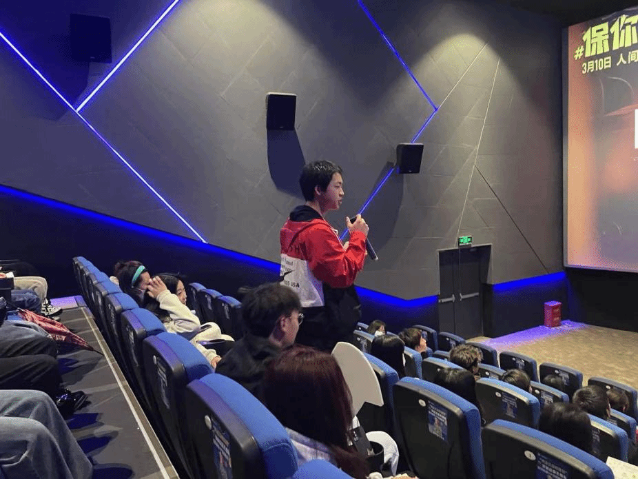 在正式观影之前,电影协会为大家准备了“看图猜电影”的小游戏进行热场,同学们积极参加,现场气氛十分热烈。看懂一部电影,需要去了解这部电影的导演。对于大鹏,很多人都是以谐星、恶俗导演这样的观点去看待他,为了打破大家对大鹏导演的刻板印象,电影协会邀请了电影评论中心的杨剑秋老师为同学们介绍导演大鹏。杨老师简单介绍了大鹏导演的作品及作品中的转变,并把《保你平安》评价为大鹏导演的“集大成之作”,此部影片不仅是大鹏继《吉祥如意》之后又一部高口碑之作,也是一部直击网生社会下女性困境的诚意之作。