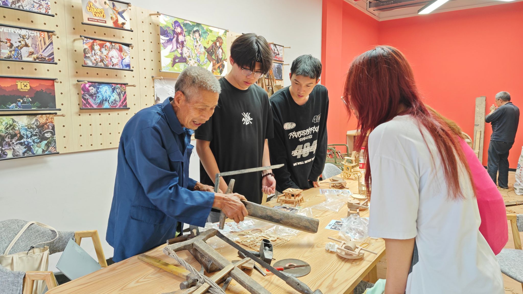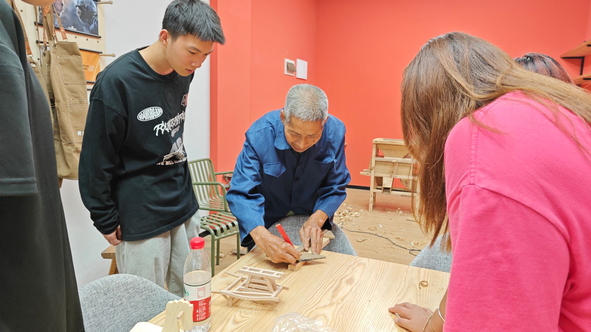 在制作的过程中,胡木匠还向同学们分享了许多关于榫卯的趣事和技巧。他讲述着榫卯结构的神奇之处,如何通过凹凸之间的巧妙结合,使得家具和建筑能够坚固耐用,同时又充满艺术美感。他还分享了自己多年来的木工经验,教导同学们如何正确使用工具,如何观察木材的纹理和质地,以及如何保持专注和耐心。