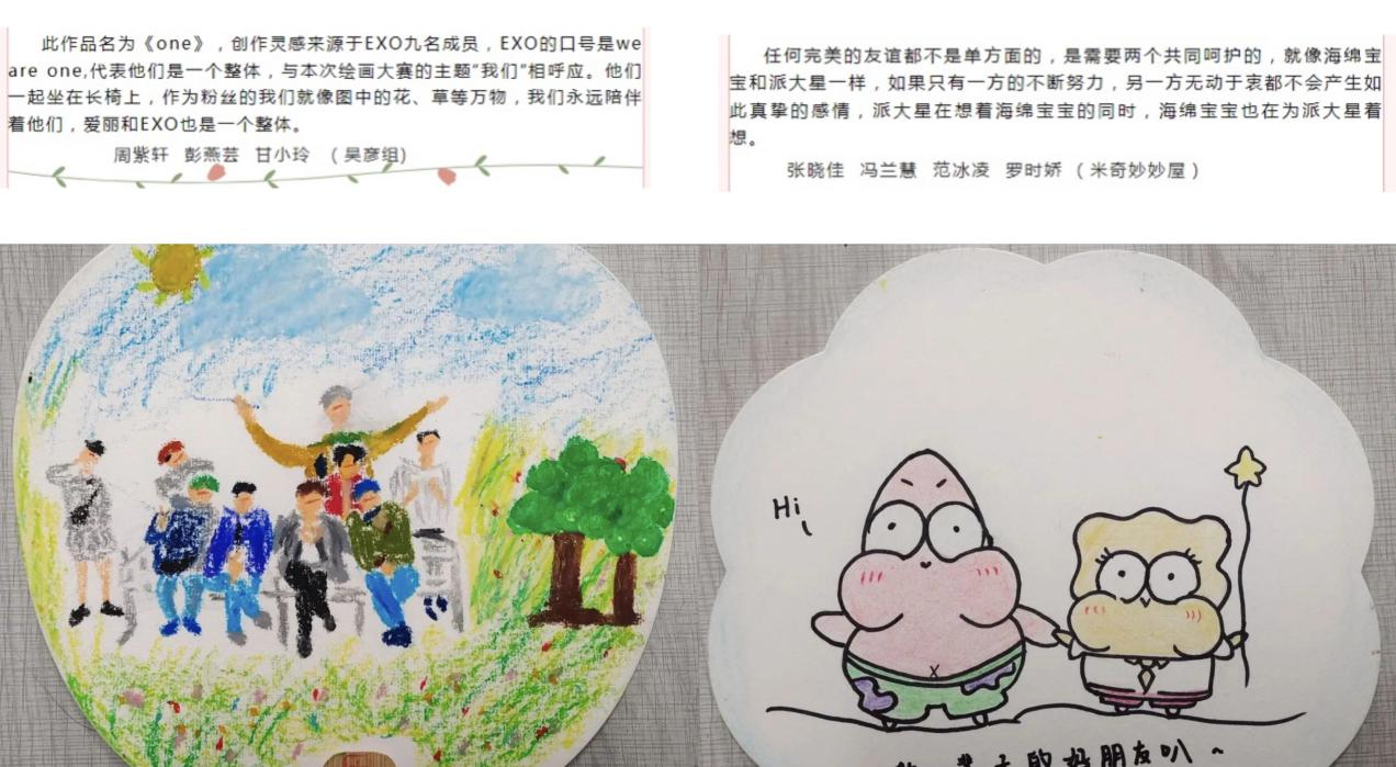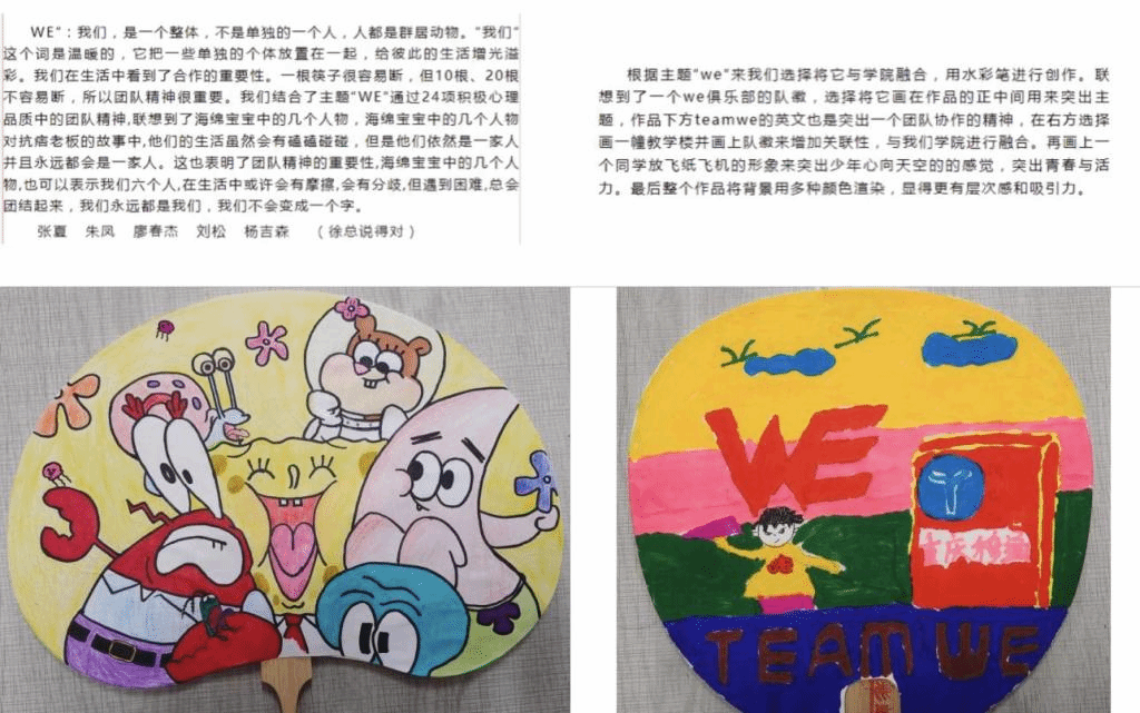 心理绘画是非语言形式表达个体情感的重要方式,本次绘画大赛以表达性艺术疗法为指导,通过心理绘画活跃校园心理艺术气氛,增加文化活力;以“WE”为主题,主题中文意为“我们”,发音同“喂”,打招呼的意思,旨在让我校师生与他人协同合作,产生思想碰撞,以色彩表达情感,以笔触搭建友谊,在创作中展现个人魅力,培养团队精神。大赛创新作品呈现形式,以扇作画,给予师生美的感受的同时增强实用性,将艺术与生活实际相结合,正如艺术疗愈中提到艺术作品的创作、欣赏和使用过程本身就具有一定的疗愈作用。