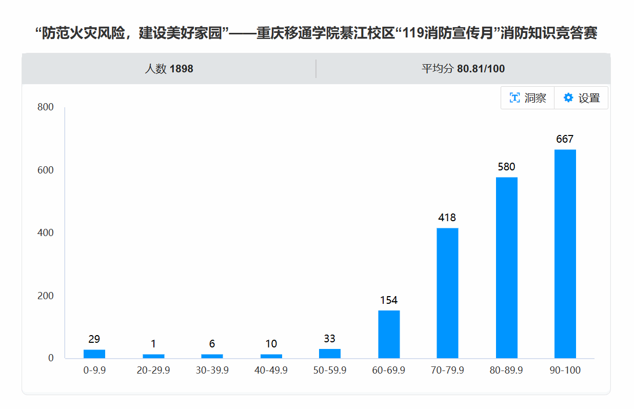 根据消防知识竞赛的数据显示与分析,参与本次知识竞赛的总人数达一千八百余人,浏览量达三千余人。这些参赛者都有着充足的消防知识储备,满分者占比近12%,80分以上的学生占比近65%,60分以上者占比近96%。消防知识竞赛的举行,进一步强化了消防知识的科普、警示教育和提示宣传。同时也让学生们深刻地认识到消防安全知识的重要性和必要性,启迪了学生们的消防安全思维。