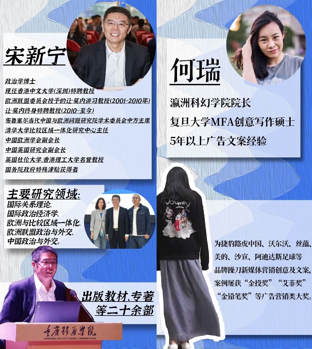 本期活动,特别邀请到现任香港中文大学(深圳)特聘教授、欧洲联盟委员会授予的“让·莫内终身特聘教授”、研究国际政治经济学领域的宋新宁教授担任特邀嘉宾,我校瀛洲科幻学院院长、复旦大学MFA创意写作硕士何瑞老师担任本期“围炉夜话”的主理人。
