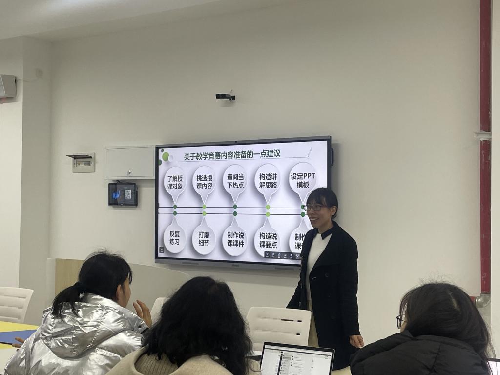 操千曲而后晓声,观千剑而后识器。陈玲老师就个人的备赛、参赛为大家指点迷津,提供宝贵的经验,分别从以下几个方面进行了经验分享:了解授课对象、挑选授课内容、查阅当下热点、构造讲解思路、设定PPT模板、制作讲课课件、构造说课要点、制作说课课件、打磨细节、反复练习。她的分析,如流水击石、微风拂叶,在场教师受益匪浅。