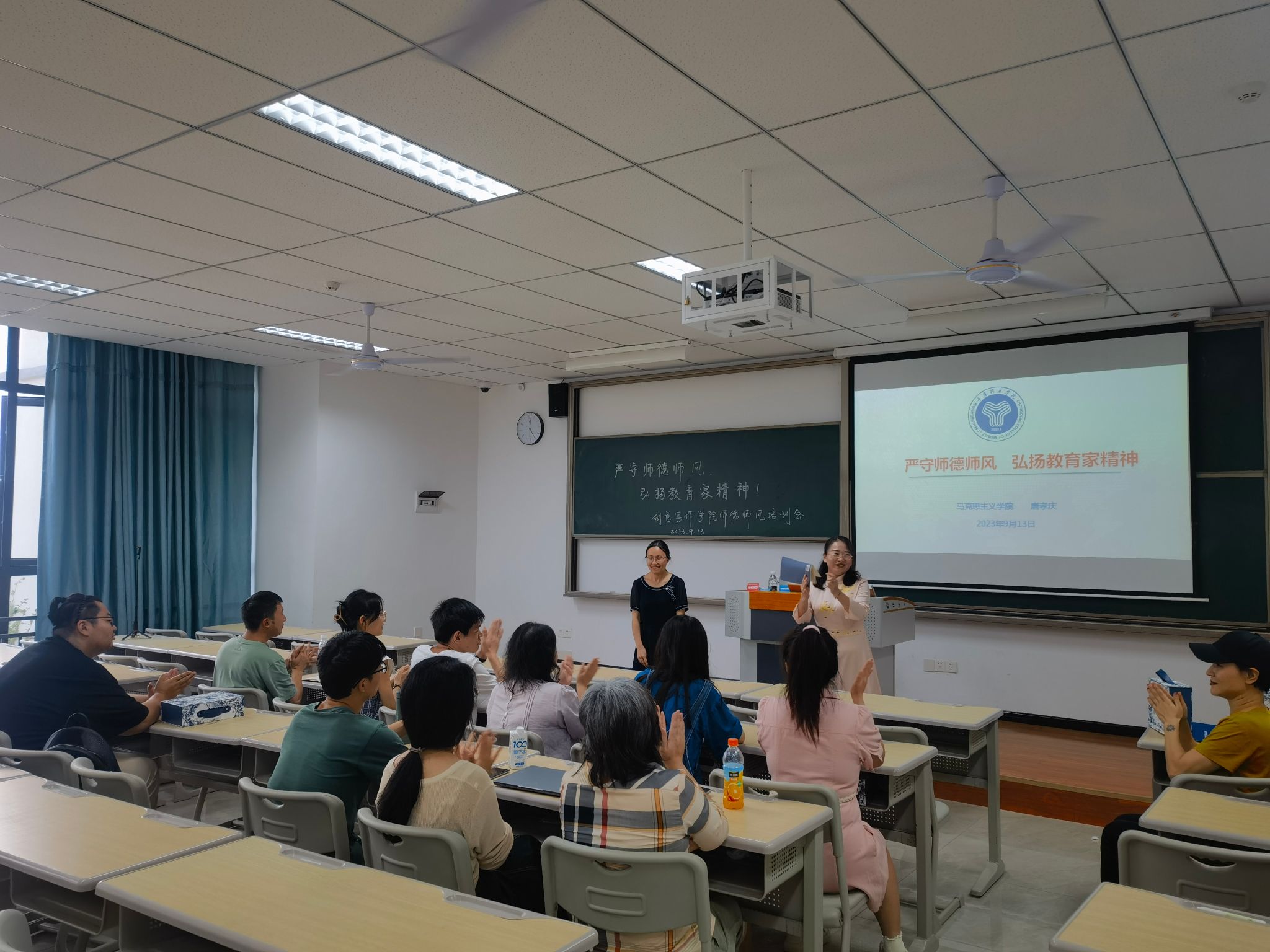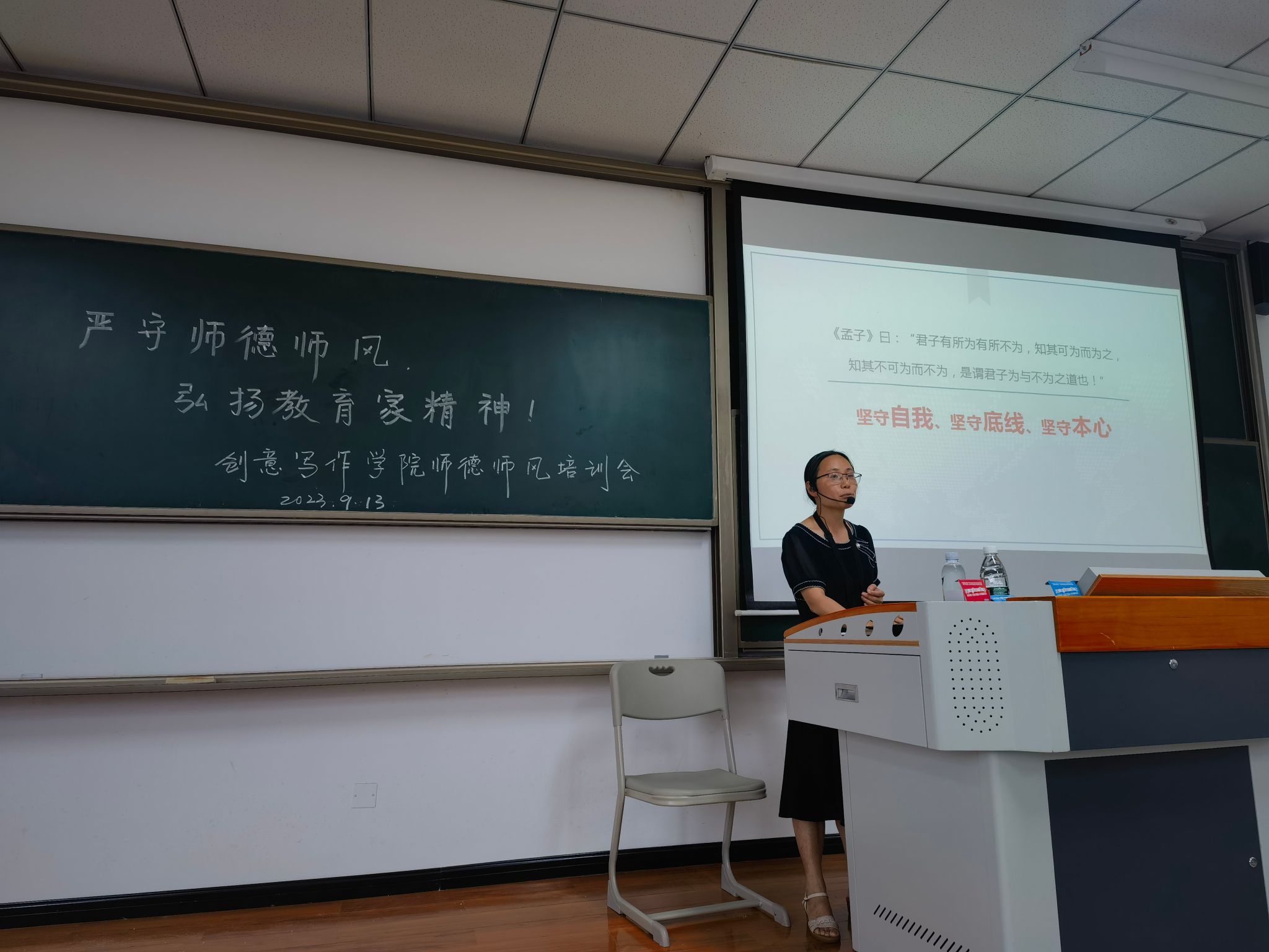 在此次培训中,唐孝庆副教授讲授了高校教师的“所为”“不为”“有位”三个方面,并带领创意写作学院全体教师认真学习党的教育方针和政策,深入学习师德师风建设的重要性和必要性,引导广大教师坚定“四个自信”,自觉践行社会主义核心价值观,争做“四有”好老师。