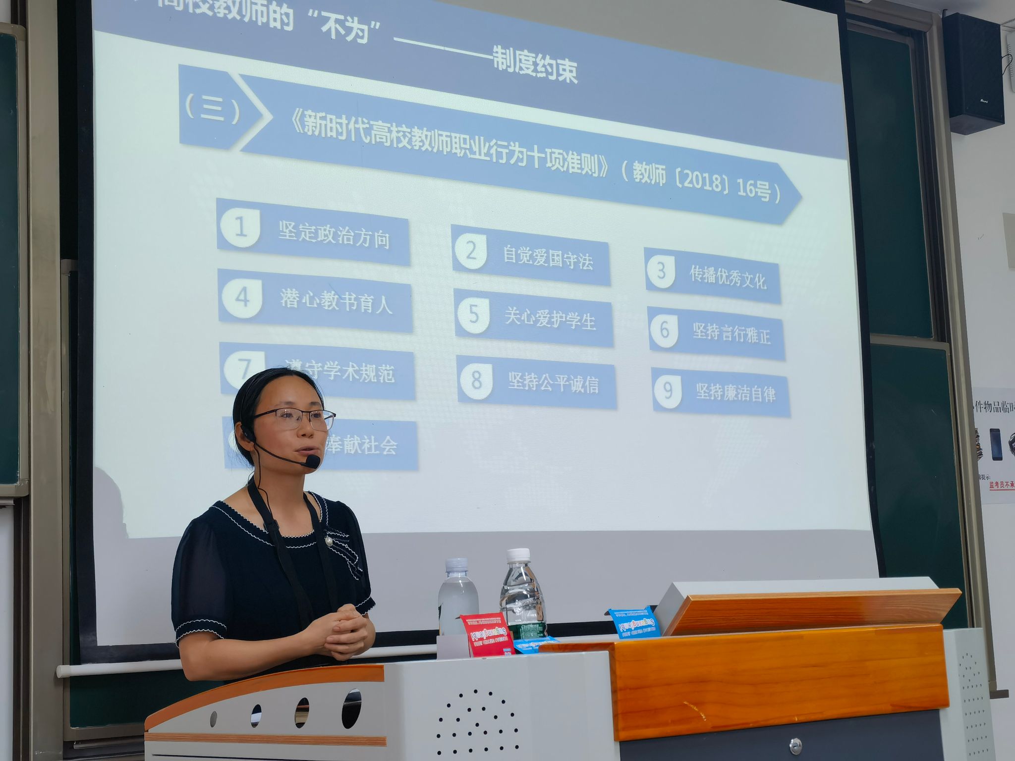 在高校教师的“不为”这一方面,唐教授带领大家重点学习了文件中教师行为规范的“六禁令”“红七条”“十准则”等相关内容,清晰明确地传达了学校关于强化师德师风建设的相关要求。