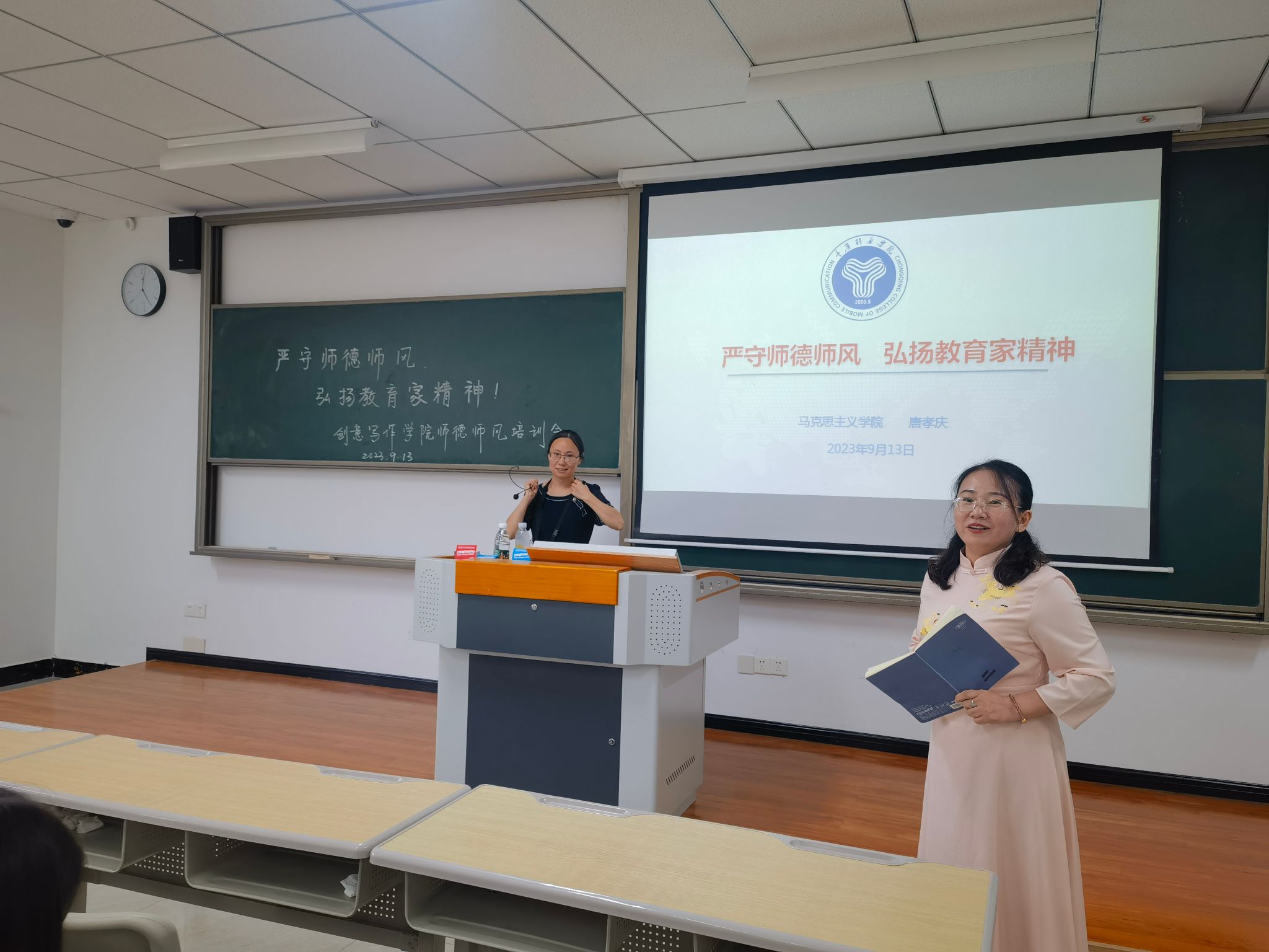 为了进一步加强师德师风建设,提高教师职业道德素养,9月13日下午5时,创意写作学院在仁者楼307室组织开展了以“严守师德师风,弘扬教育家精神”为主题的师德师风培训会。创意写作学院教研室主任刘明主持会议,特别邀请重庆移通学院马克思主义学院马克思主义基本原理教研室主任、副教授唐孝庆进行培训讲座,副院长苏瓷瓷总结发言,学院全体教师参加。