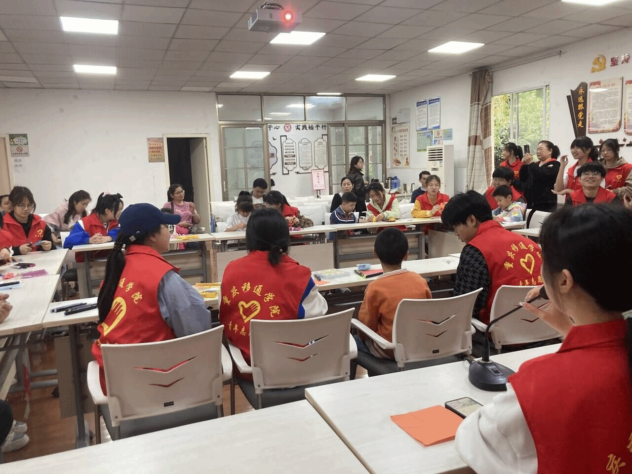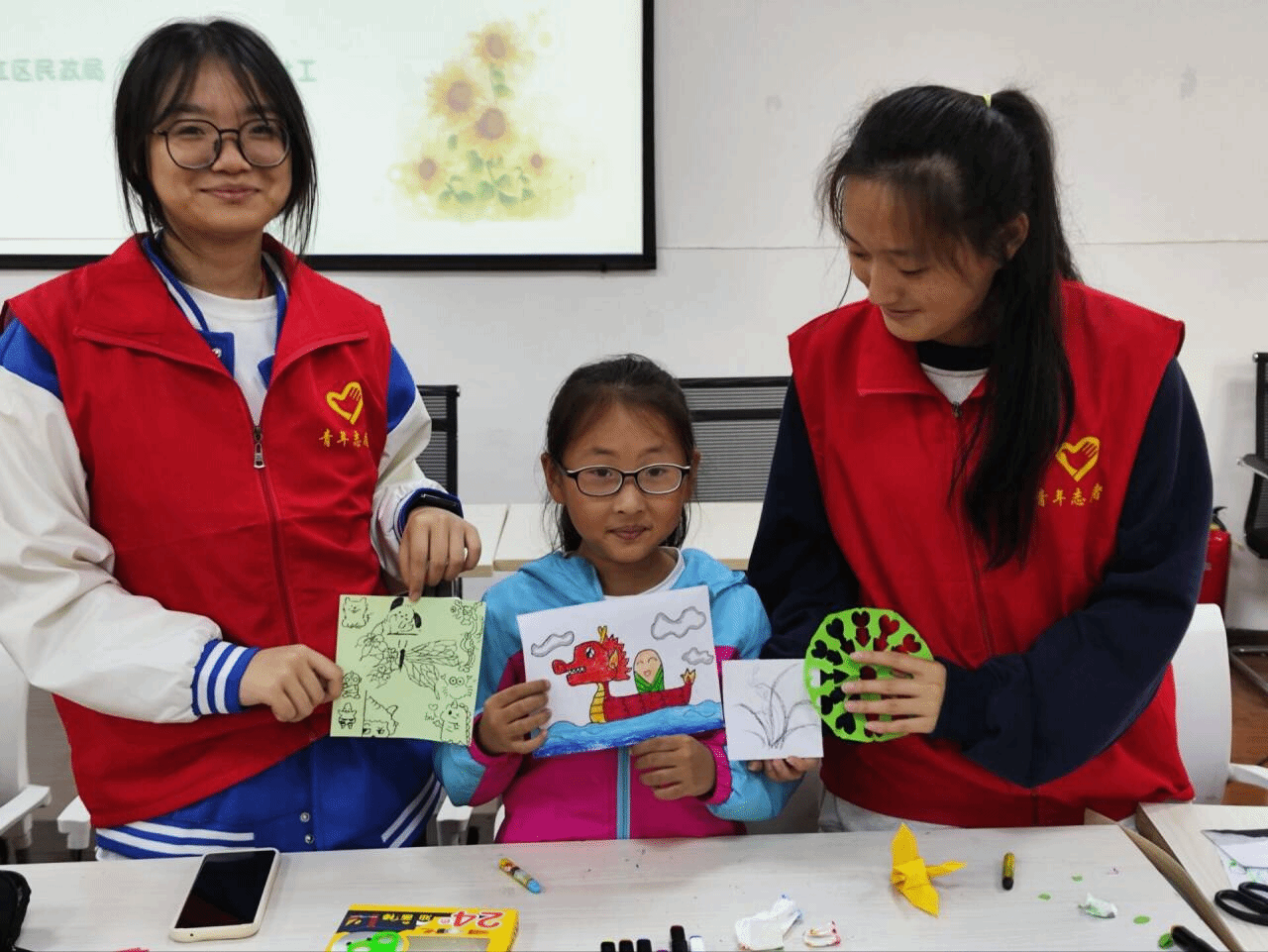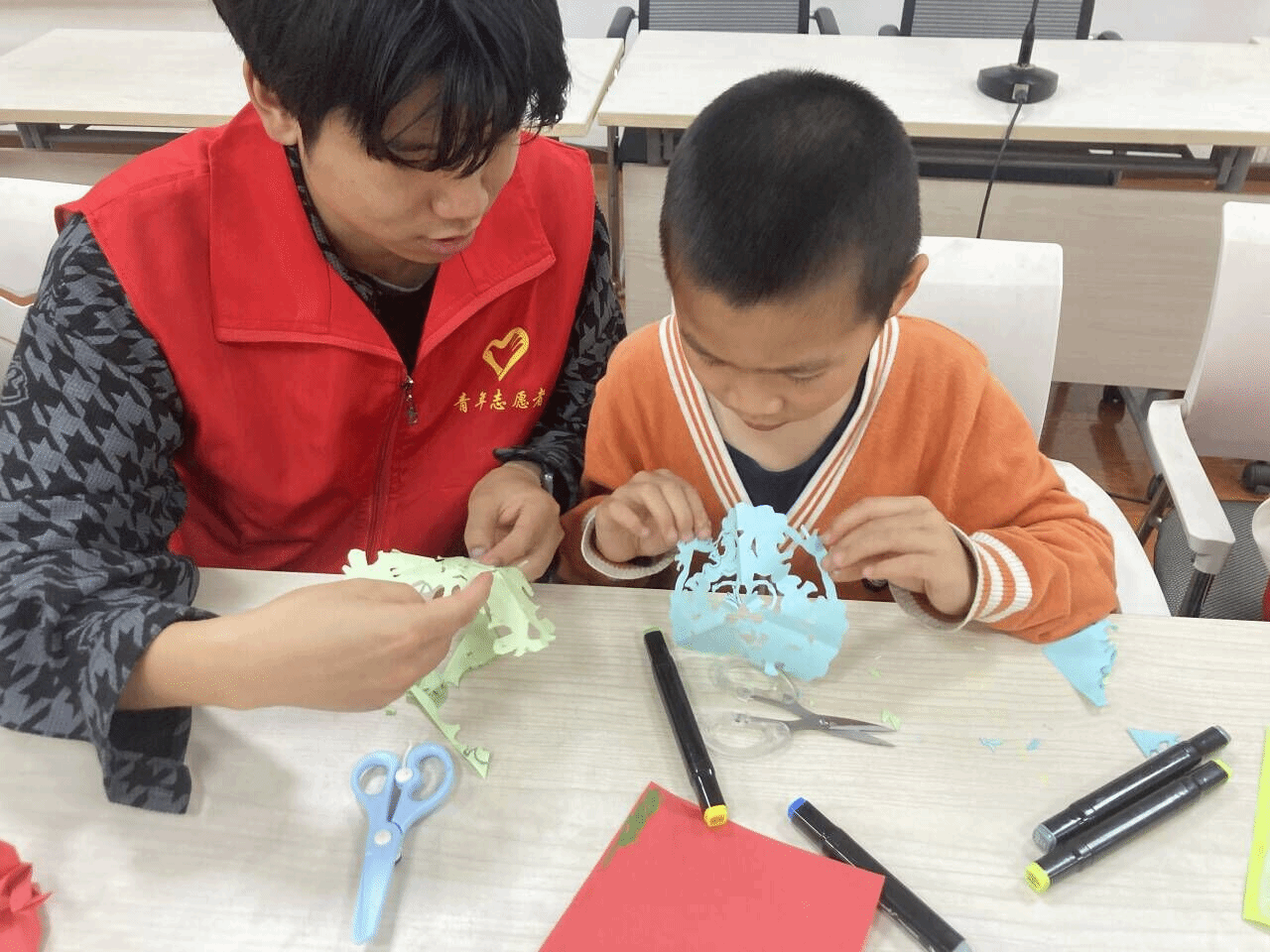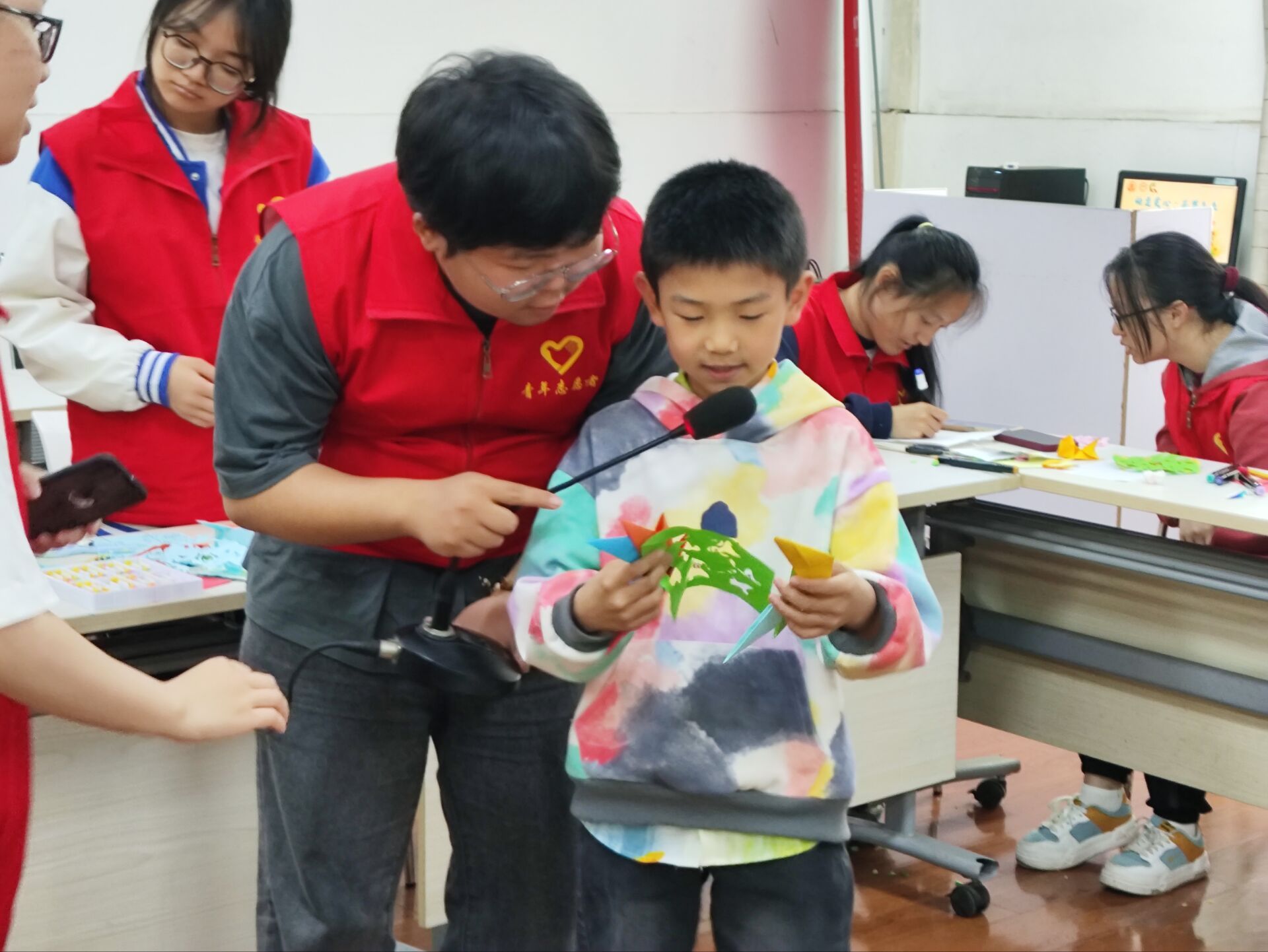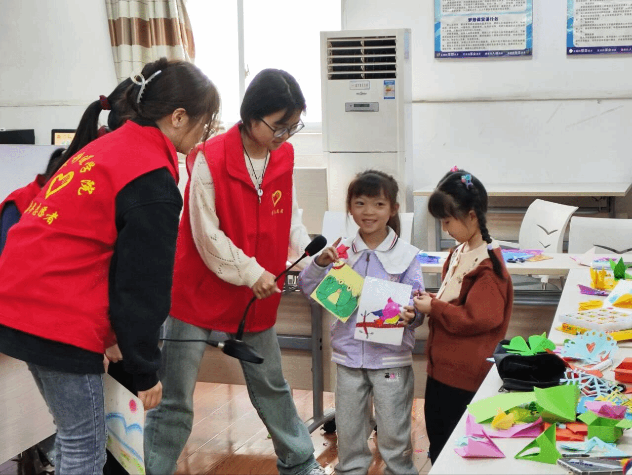 在教学环节中,志愿者们手持剪刀和纸,详细讲解了剪纸的历史渊源和技法特点,亲身示范了如何运用剪刀和纸张创造出各种精美绝伦的图案,向小朋友们展示了剪纸艺术的独特魅力。耐心的指导小朋友们掌握“折、画、剪”的基本技巧,细心为他们的创作保驾护航。在志愿者们的精心指导和小朋友们的努力下,一张张普通的宣纸在孩子们手中化身为一幅幅充满创意的剪纸作品。
