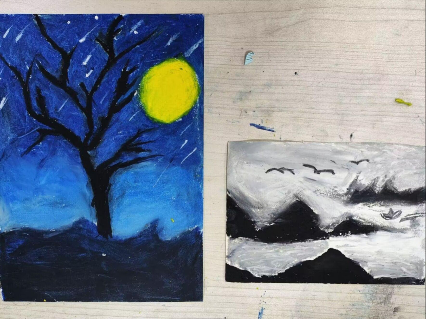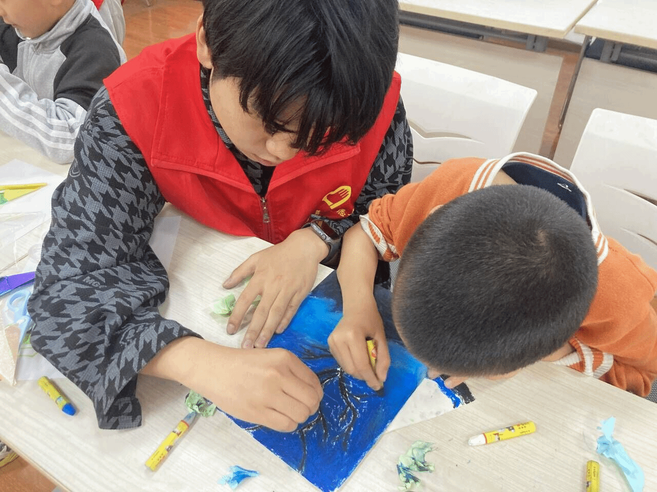 与此同时,绘画活动也在同步进行着。志愿者们准备了相关工具引导他们绘制具有中国特色的画作。小朋友们时而涂抹,时而揉擦,在画纸上勾勒出星月、山海等美丽景象。一幅幅充满奇思妙想的画作应运而生,展现了小朋友们无尽的创造力和想象力。