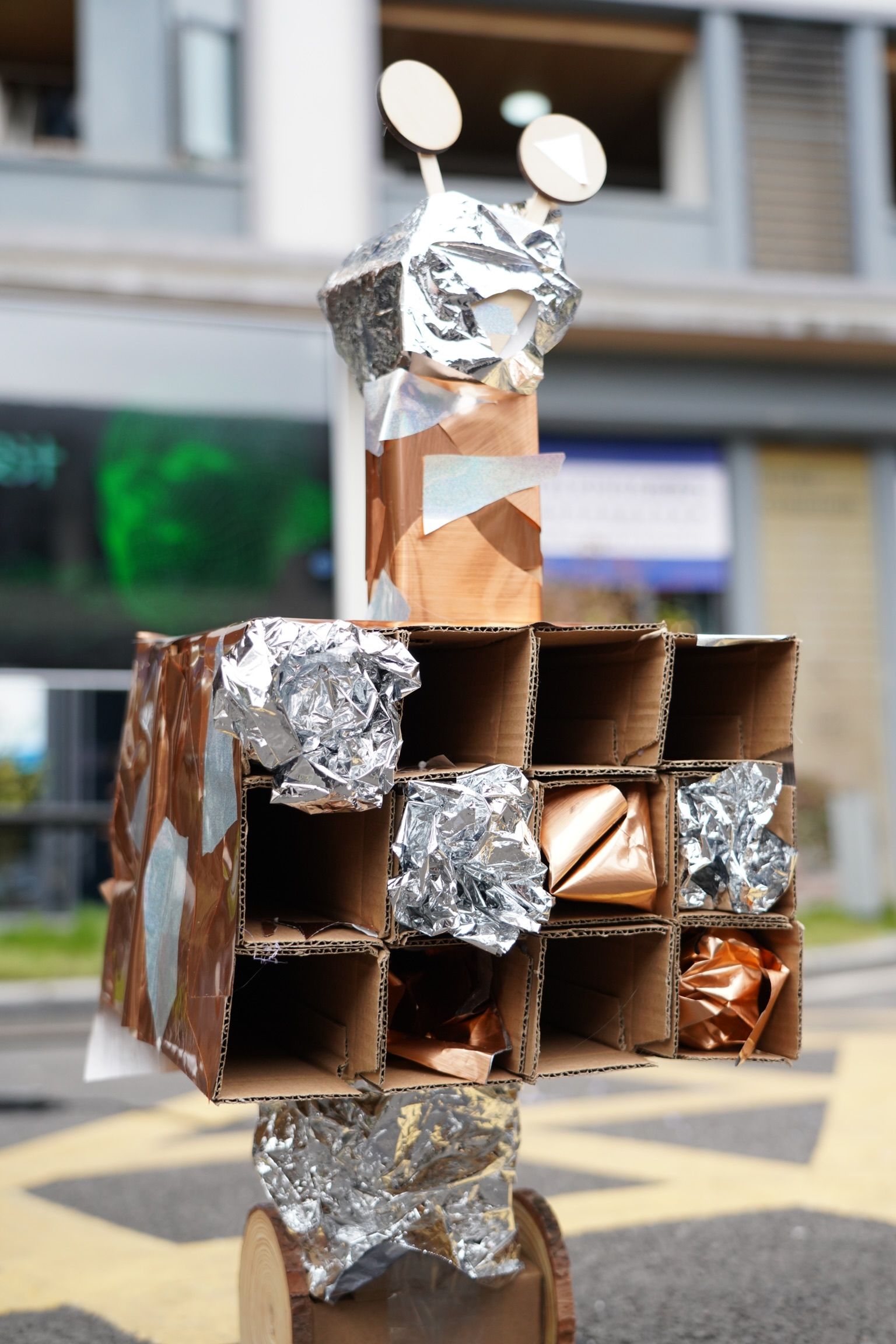 活动的第二环节是自由创作。陈轩同玥老师领衔对活动现场进行维护,刘佳莹、黄永佳、刘珂与李筱璐、李春阳、赵守伟、陈慧等老师也为学生们分发创作工具,随时准备为学生提供帮助。根据学生人数,该环节的创作被分为若干小组,以不同的材料和媒介进行创作。同学们群策群力,互相配合,有的负责提供机器人的创作思路,有的负责搭建机器人的骨架与造型,有的选配使自己作品更为突出的色彩,在紧张与有序的创作过程中,该环节获得了极高的人气。