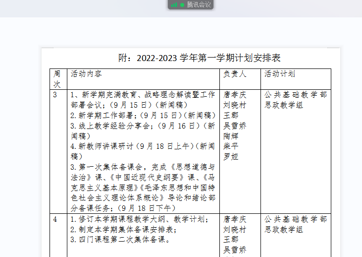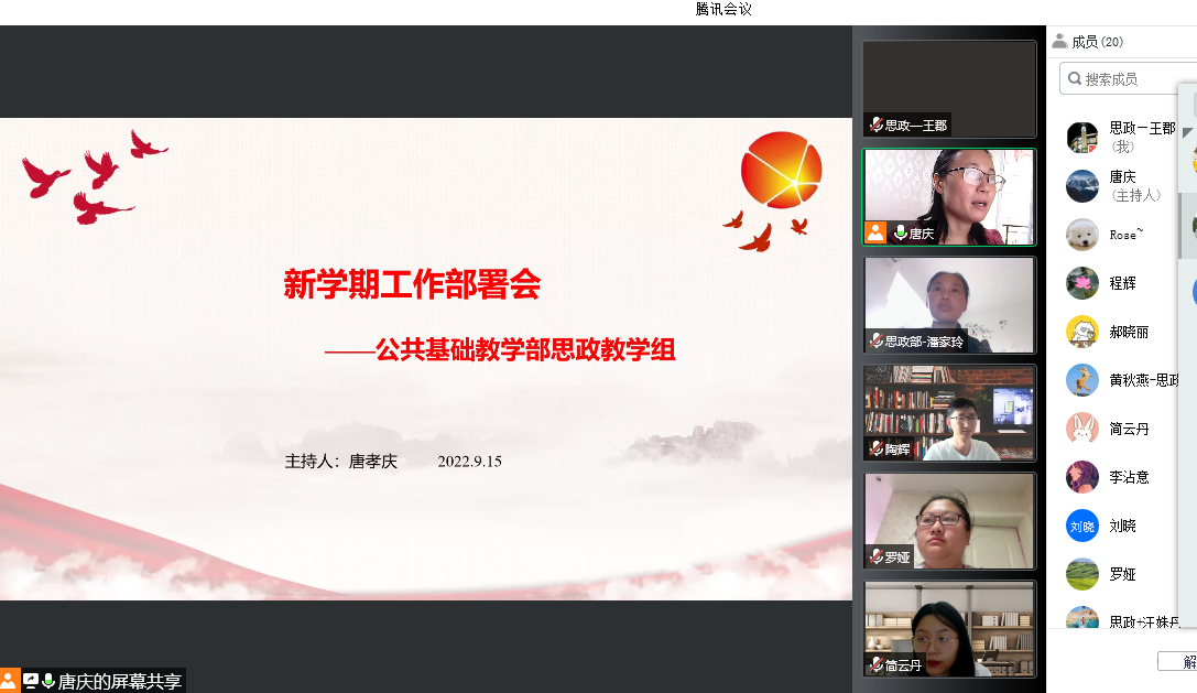 新学期开启新征程,新目标引领新方向。为保证新学期各项工作有条不紊进行,2022年9月15日上午11点,根据新学期疫情形式相对紧张的现状,公共基础教学部思政教学组组长唐孝庆老师组织思政教学组的20位教师通过腾讯会议开展了新学期工作部署会。