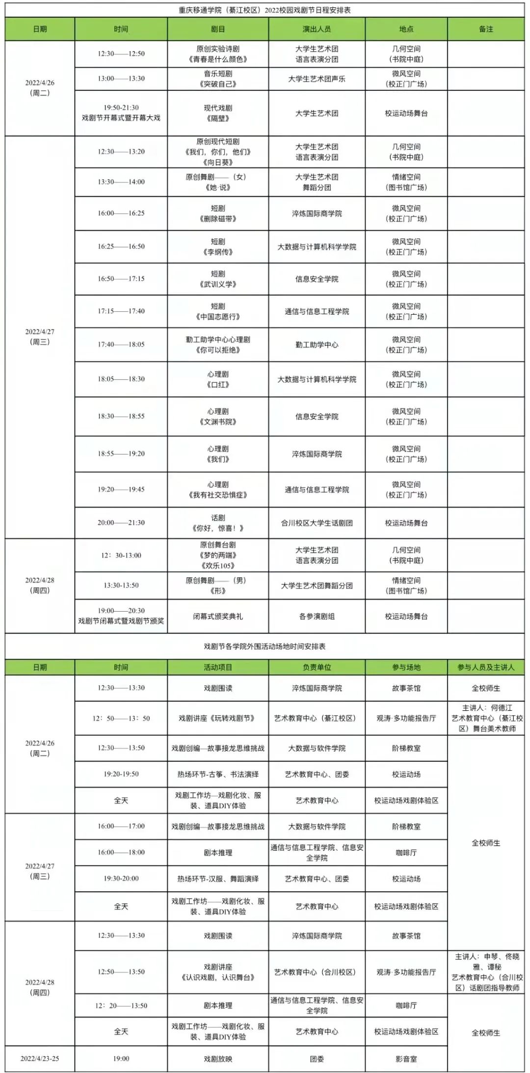 本次綦江校区戏剧节,由戏剧梦工厂、戏剧乌托邦、戏剧嘉年华三大单元组成,以“YOU”戏为主题,契合綦江校区艺术发展新步伐,结合完满教育艺术修养板块,让同学们近距离感受当代潮流戏剧艺术。打破原有的舞台剧场模式,充分结合綦江校区布局特点打造轻沉浸式环境戏剧,在表演中做到与环境、观众的双重沉浸式融合。真正让戏剧从生活发声、在校园发生,展现未来“YOU”戏的新生力量。