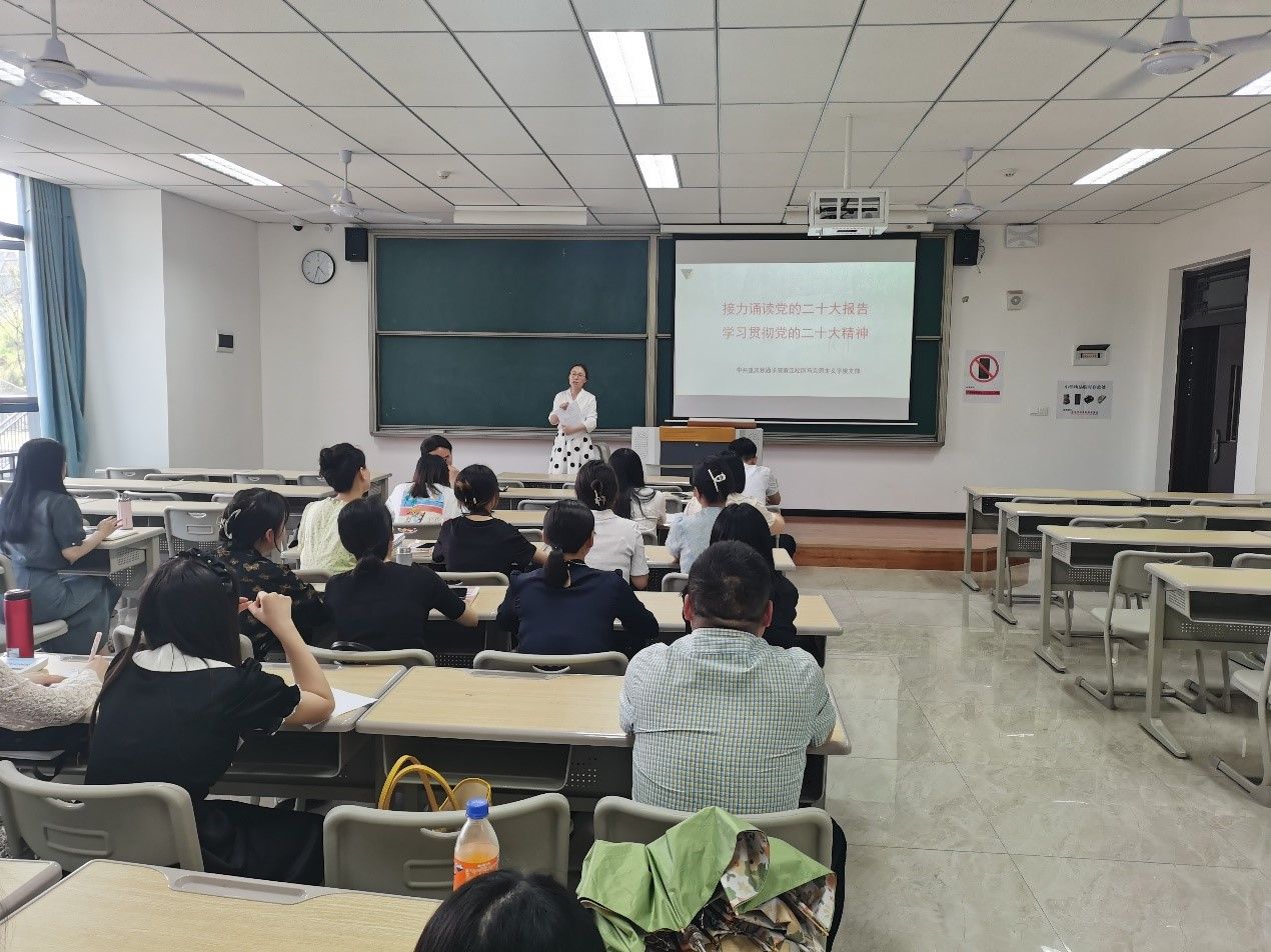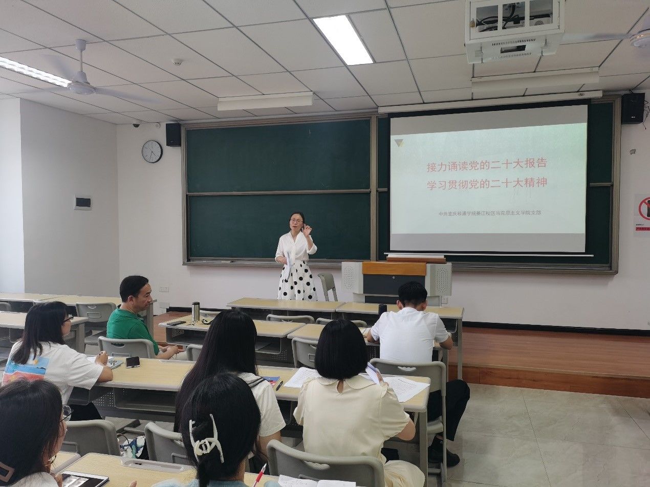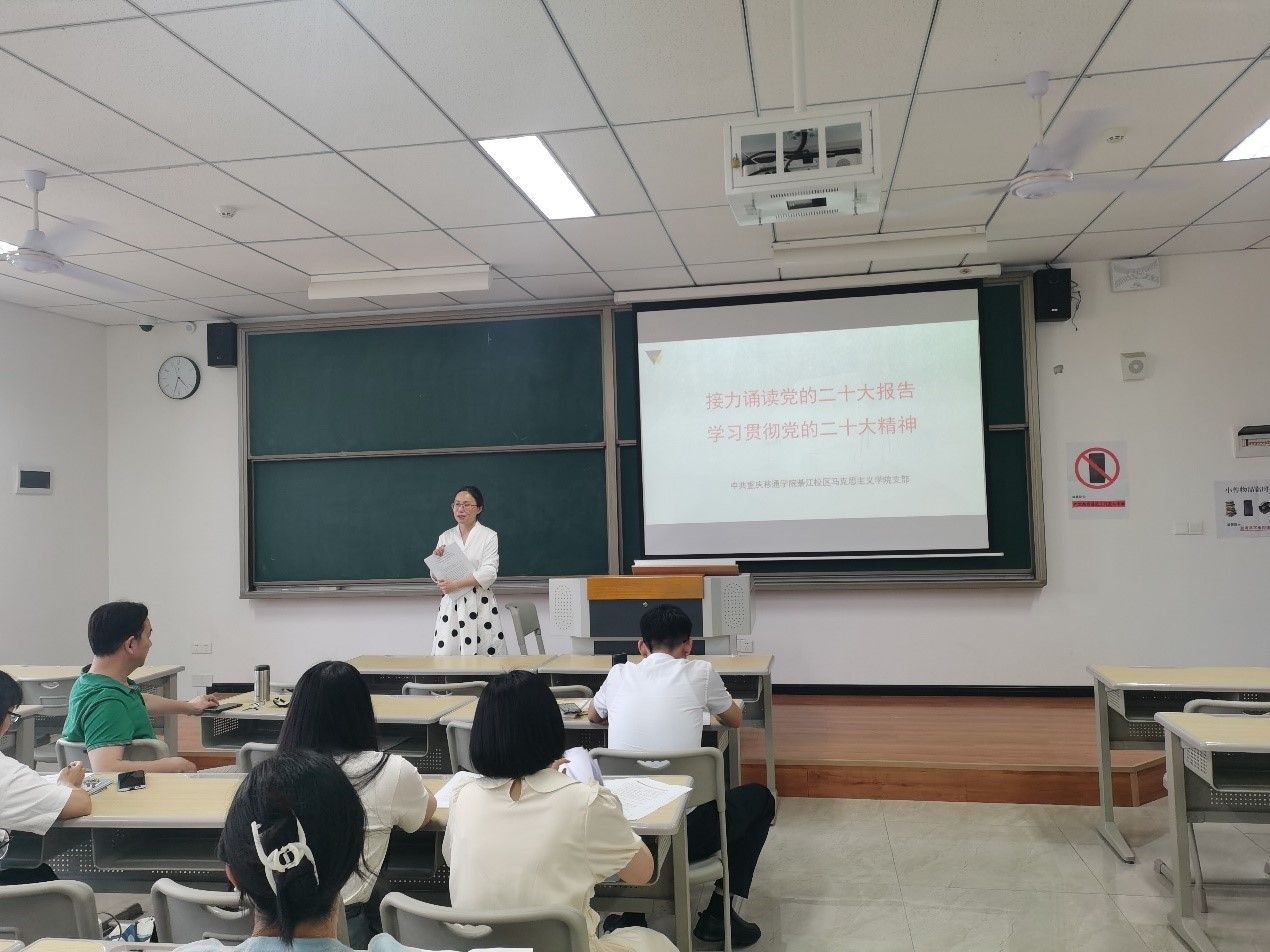 为全面深入学习党的二十大精神,进一步学习贯彻习近平新时代中国特色社会主义思想,2023年4月19日下午,重庆移通学院綦江校区马克思主义学院党支部在仁者楼308教室开展了“接力诵读党的二十大报告,学习贯彻党的二十大精神”主题党日活动。本次会议由支部书记唐孝庆老师主持,全体思想政治理论课专职教师参加。