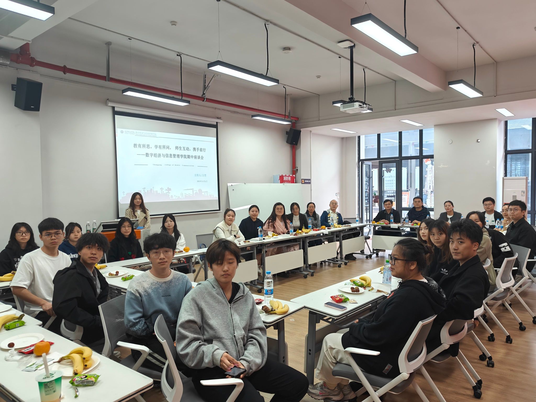 为深入了解同学们的思想动态和学习情况,及时解决同学们在学习和生活中遇到的各种困难和问题,掌握同学们对教学、管理、活动等方面的意见和建议,数字经济与信息管理学院于2024年11月6日下午14点在玉棠书院扎堆朋辈空间成功开展了2024-2025学年第1学期期中学生座谈会。此次座谈会邀请数字经济与信息管理学院院长刘贵容教授、教学副院长王哲副教授以及各教研室主任、骨干教师和学生代表们共计30余名。此外,还非常荣幸的邀请到了学生处唐尚静处长,教务处教务科谭臣臣副科长,科学教研室主任胥云龙老师,国际教育学院英语教研室主任朱陶老师,数理教学部微积分核心课程负责人吴小瑞老师,思政教学部中国近现代史纲要核心课程负责人吴雪娇老师,形势与政策课程负责人贺铭钰老师等参与此次座谈会。