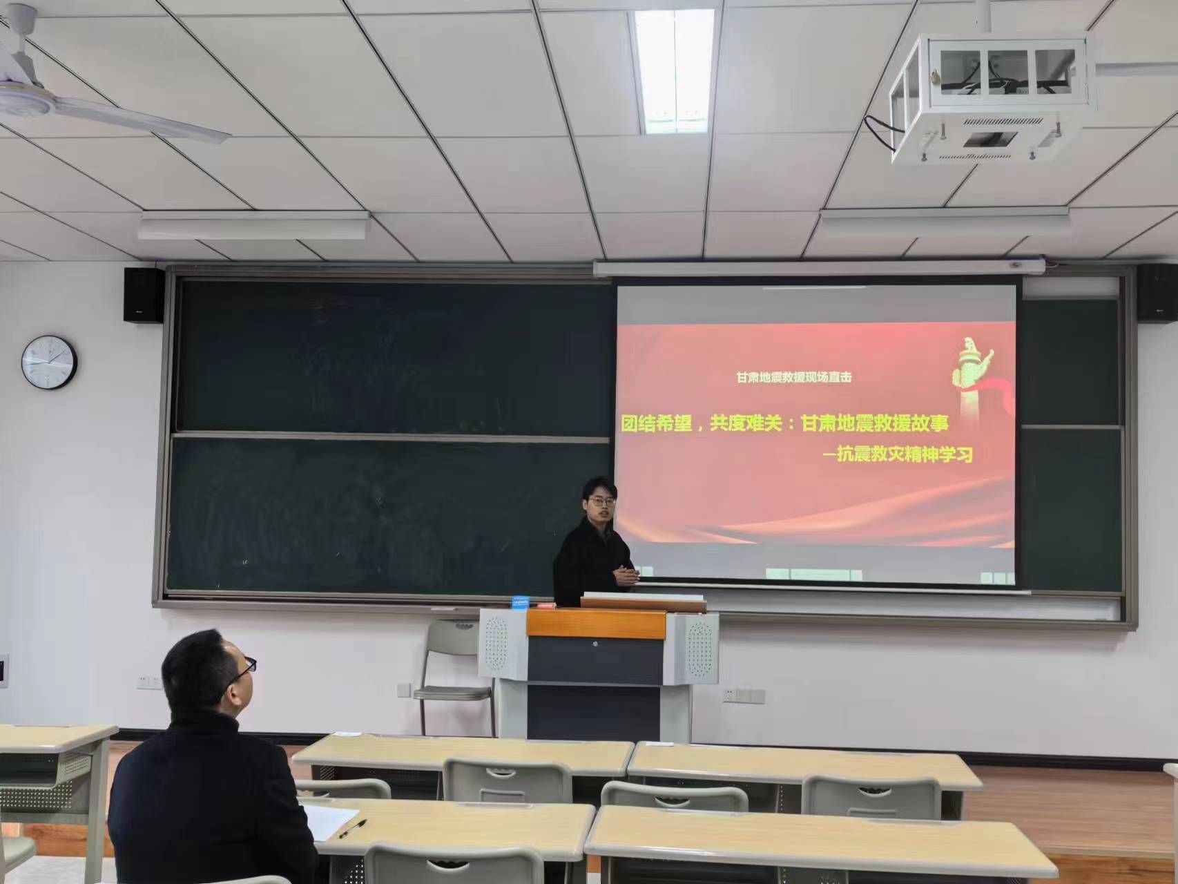 会议第三部分,陈熙委员就12月18日23时59分发生的甘肃积石山县地震,开展抗震救灾精神学习,对地震灾区现场具体情况通过图片与视频的方式让支部党员同志充分了解第一线的情况,也让各位党员看见了党中央的火线支援、先进党员工作者的满腔热血与中华民族的血脉相连。党始终不断凝聚人民的意志,让中国能够无往不胜。