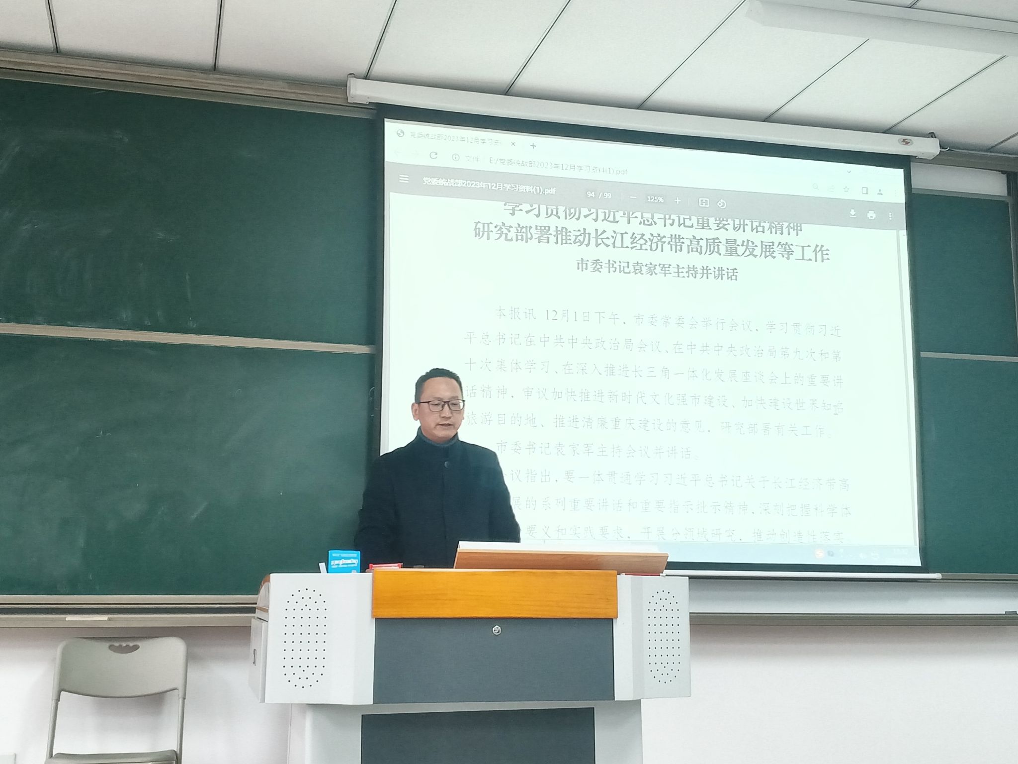 会议第一部分,范保珠书记对关于市委书记袁家军在推进长三角一体化发展座谈会上的重要讲话精神进行组织学习。范书记传达会议核心精神,要深学笃行习近平文化思想,聚焦促进人的全面发展和社会全面进步,推进清廉重庆的建设。同时强调在校的教师团队也不要松懈日常党政知识的学习,希望老师党员们能以身作则,发挥党员的先锋模范作用,坚守信仰信念,强化党性修养。