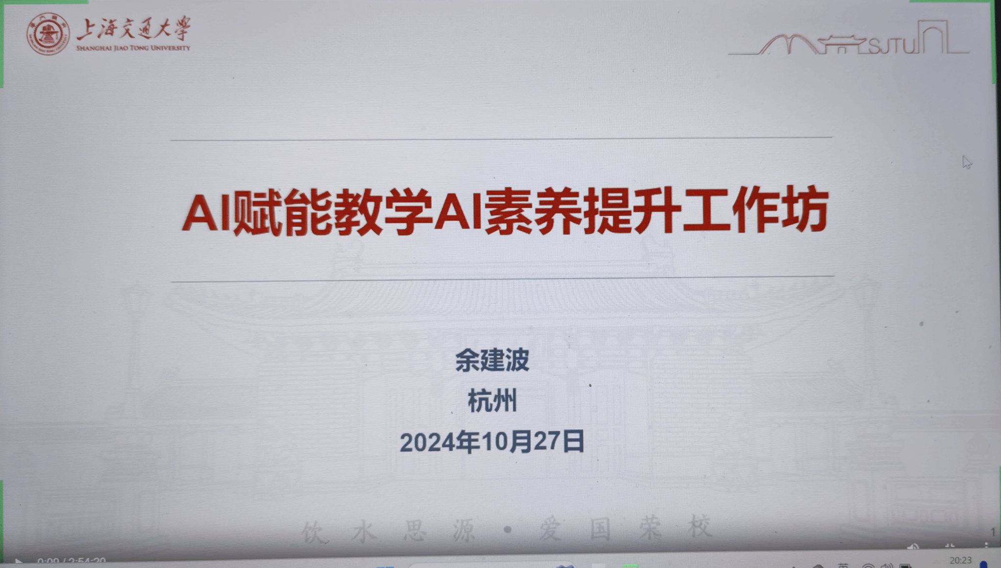 10月27日上午由上海交通大学余建波教授讲授,主题是《生成式人工智能技术与智慧课程建设》,余教授是上海交通大学教务处课程建设负责人,主要负责在线课程、 重点课程、一流课程的建设应用及申报推广,并组织老师进行线上线下混合式教学工作坊。