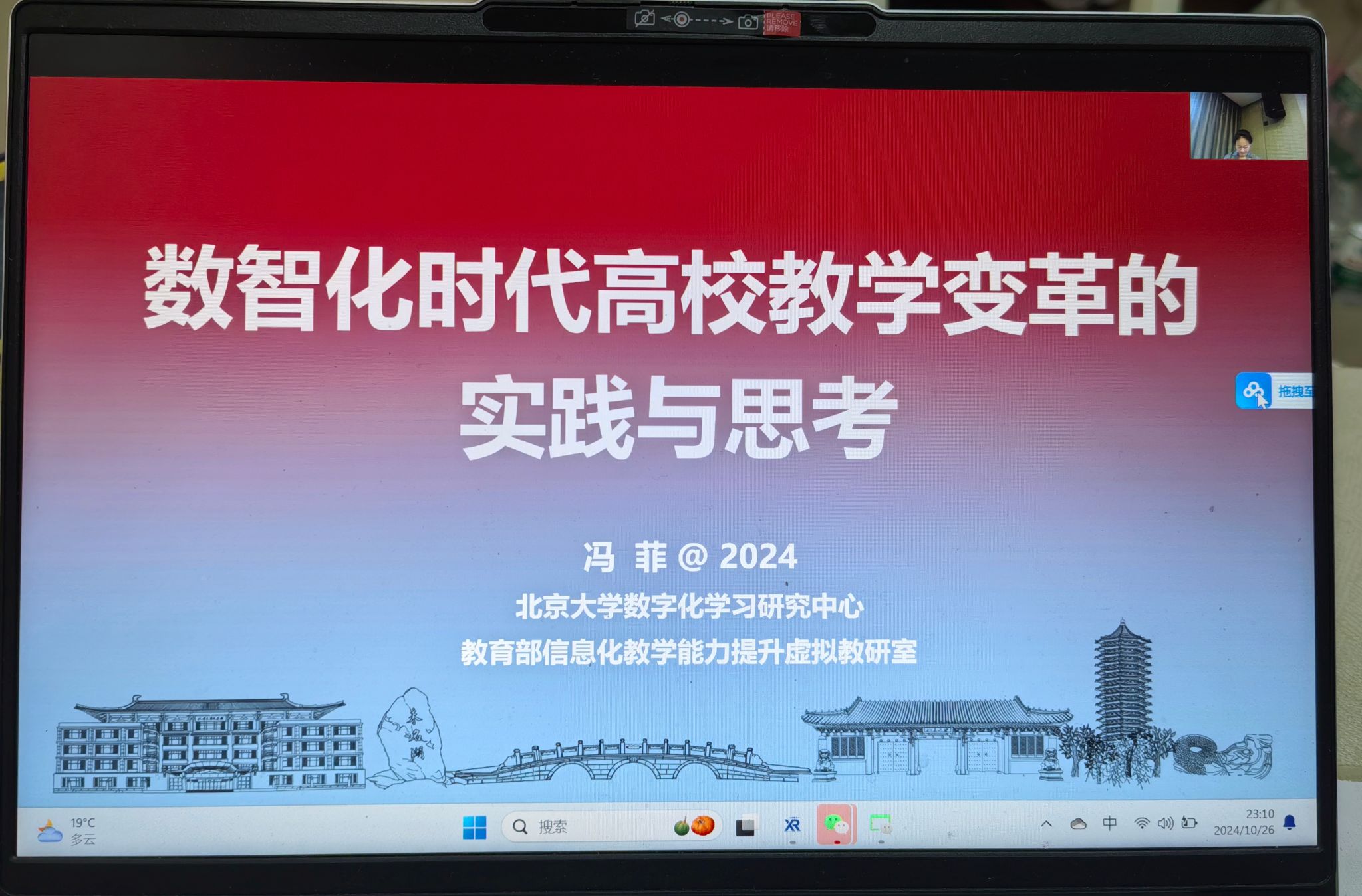 10月26日下午,邀请了北京大学教师教学发展中心综合办主任冯菲授课,主题是《数智时代高校教学创新与实践》,冯主任是北大数字化学习研究中心主任助理,主要研究领域为数字化学习、在线教学和混合式教学。