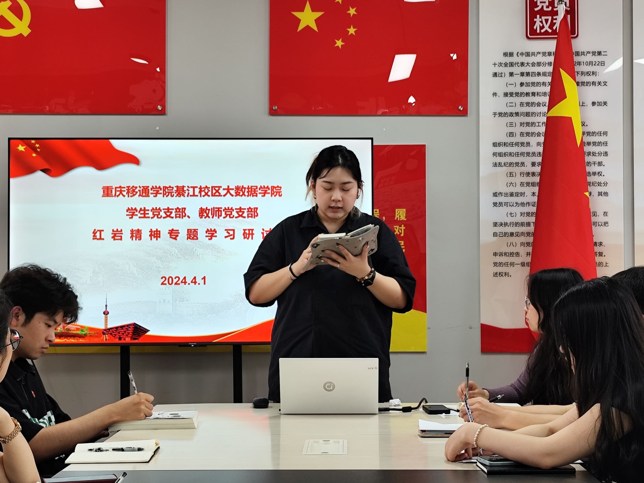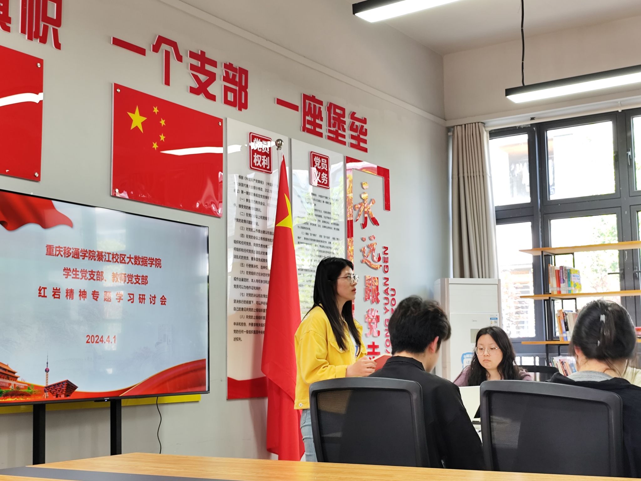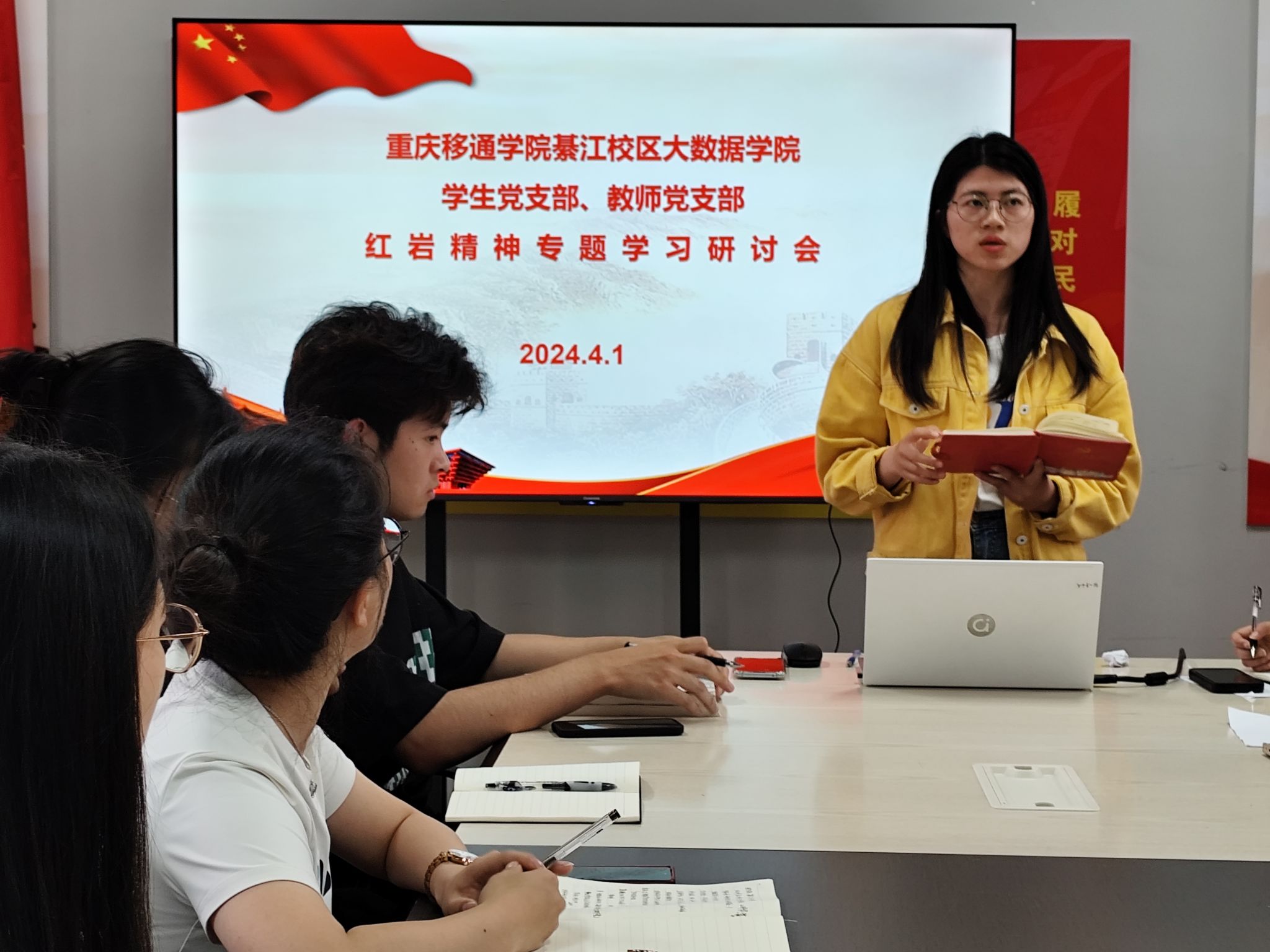 追寻红色足迹,传承红岩精神,以信念为动力,用信仰赴青春。在重庆这块英雄的土地上,广大青年需要对红岩精神进行持续学习与头脑武装。为持续对党员进性培养、教育,大数据学院学生党支部、教师党支部在依托前期白公馆及重庆1949大剧院等红色基地进行“追寻红色足迹,传承红岩精神”主题学习的基础上,特举办本次红岩精神专题学习研讨会。本次会议由大数据学院学生党支部副书记雷淑娟同志主持。