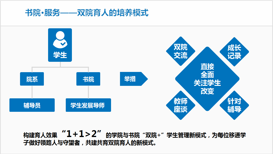 生活在书院,专业在学院。书院是传统教育阵地赋予现代教育内涵的创新育人机制,是学校全员、全方位、全过程、全天候育人的思想政治教育新举措。作为社区化、交互性、共享式的育人平台,支撑学校“信息产业商学院”办学愿景,依托家文化和领导力双核驱动实践育人、文化育人、服务育人质量提升,为学生创造社区共享与朋辈互助的新圈层。