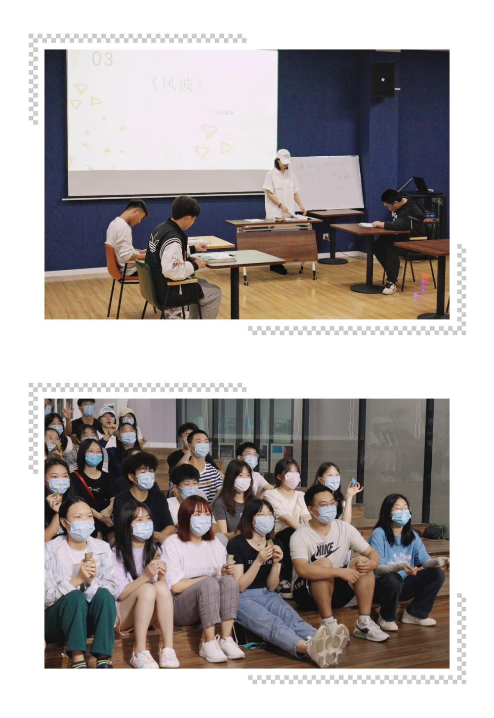 29班自编自演的小品《风波》通过跌宕起伏的剧情,以宿舍为单元真实演绎了大学生的学习变化,让同学们意识到学风建设和自身努力的紧密关联。台上的演员们全情投入,台下的同学们目不转睛,整个过程笑声一段接一段,快乐不断的氛围萦绕在活动室久久不散。
